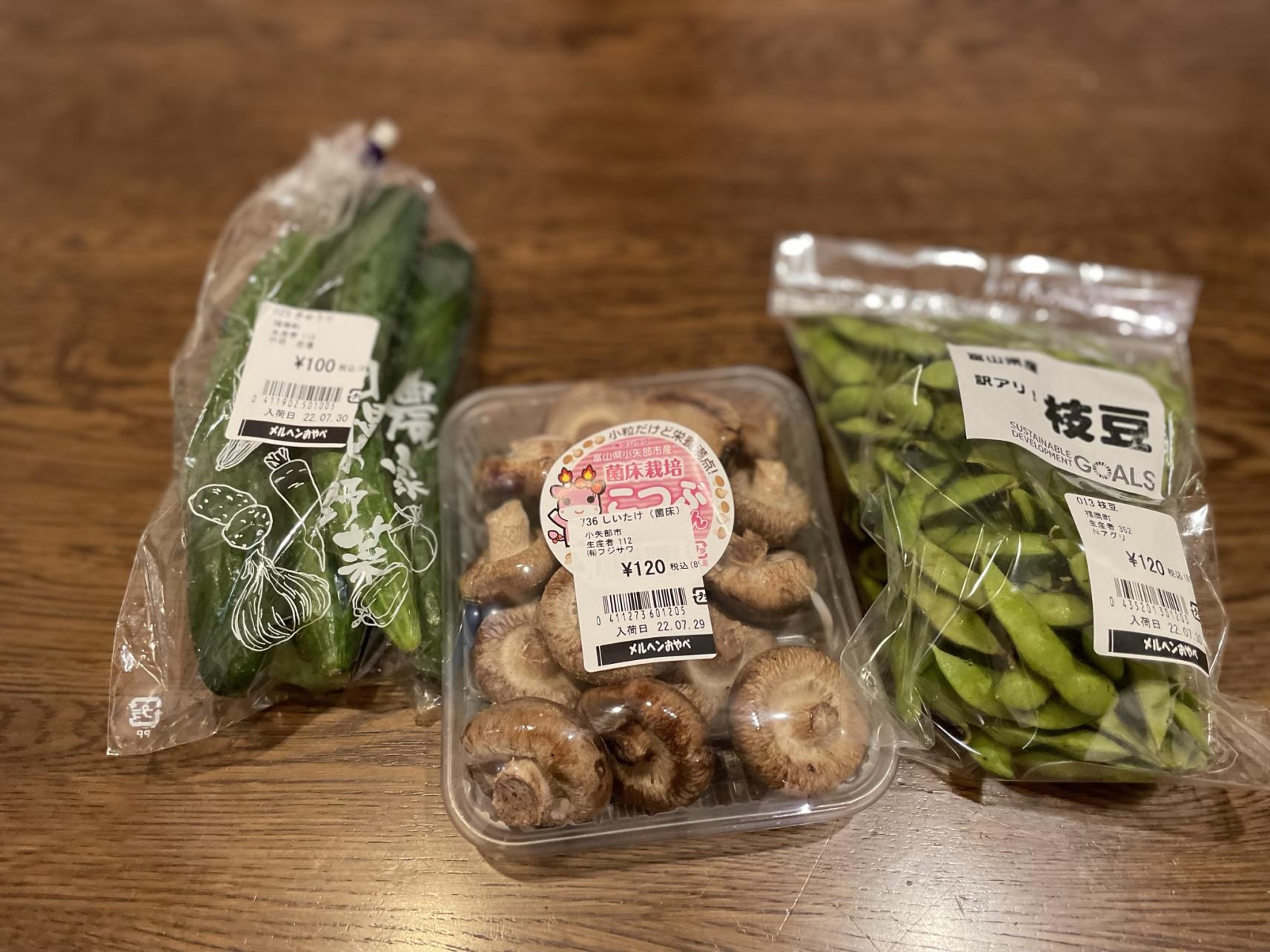 今回は、お土産店でこんぶ餅と昆布きんつば、不動おやきを買い、農産物直売所できゅうり、しいたけ、枝豆を買いました。