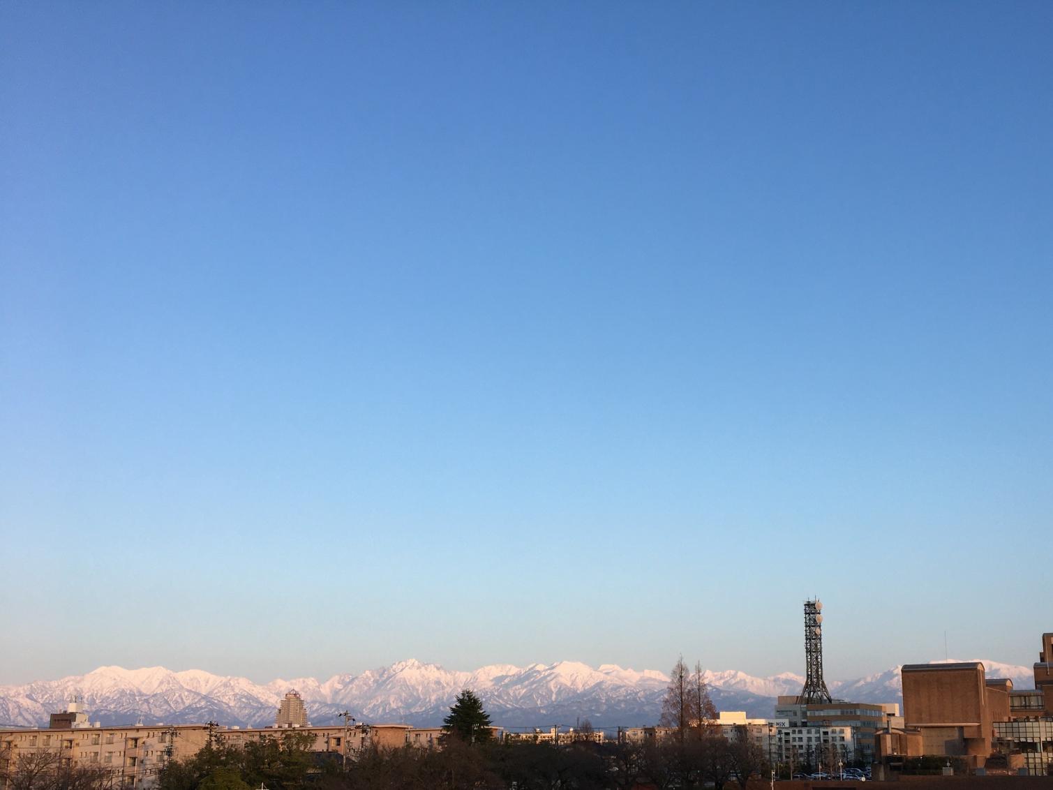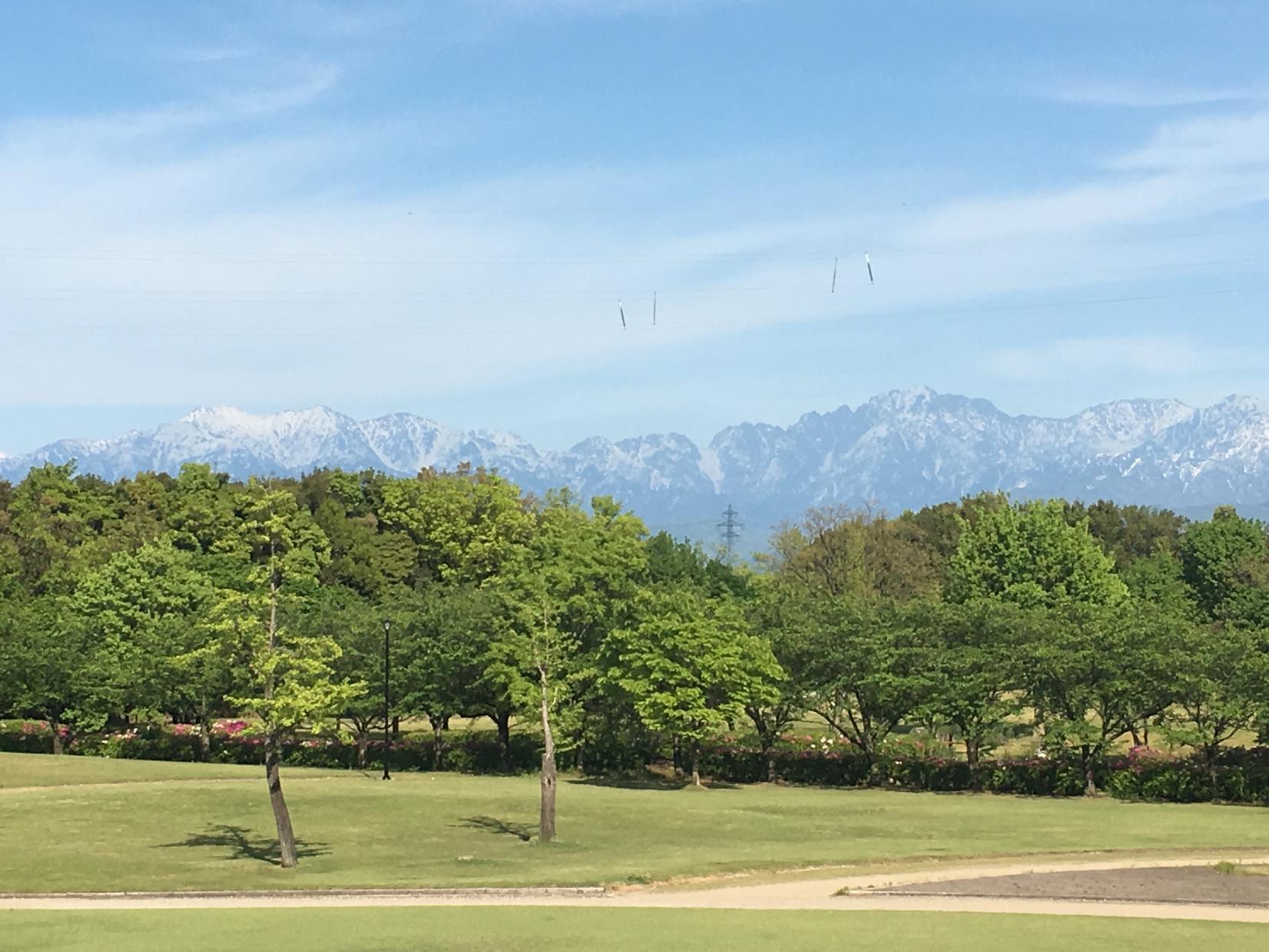 遊具エリアの裏は新幹線の線路。そこから振り向くと、晴れた日には立山連峰が見えます。