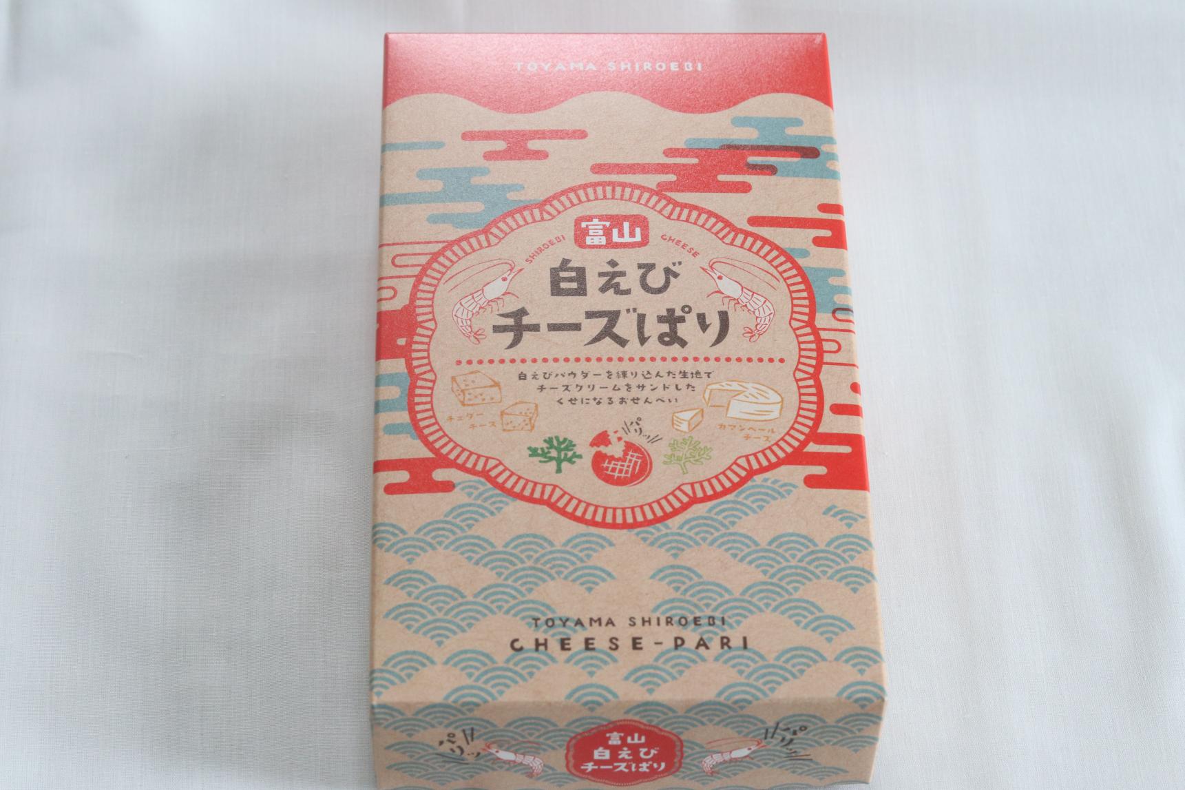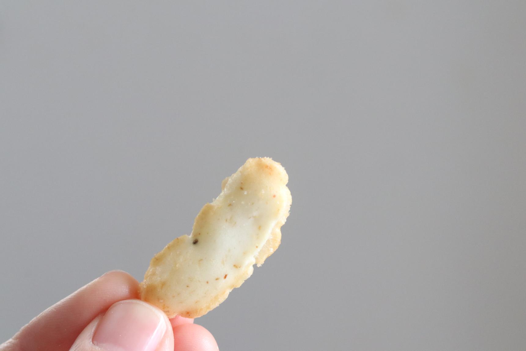 まず気になるのが名前。「白えび、チーズ、ぱりとは?」となりますよね(私だけ?)。中身はその名のとおり、白えびパウダーを練りこんだせんべいに、チーズクリームをサンドした、パリっとしたおせんべいです。
