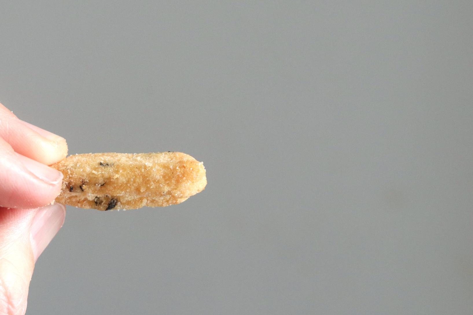 この白えび味は、たっぷり白エビパウダーがまぶしてあります。軽い食感は、もはや「あられ」というよりスナック菓子の領域。手が止まらなくなるのでご注意を(笑)。