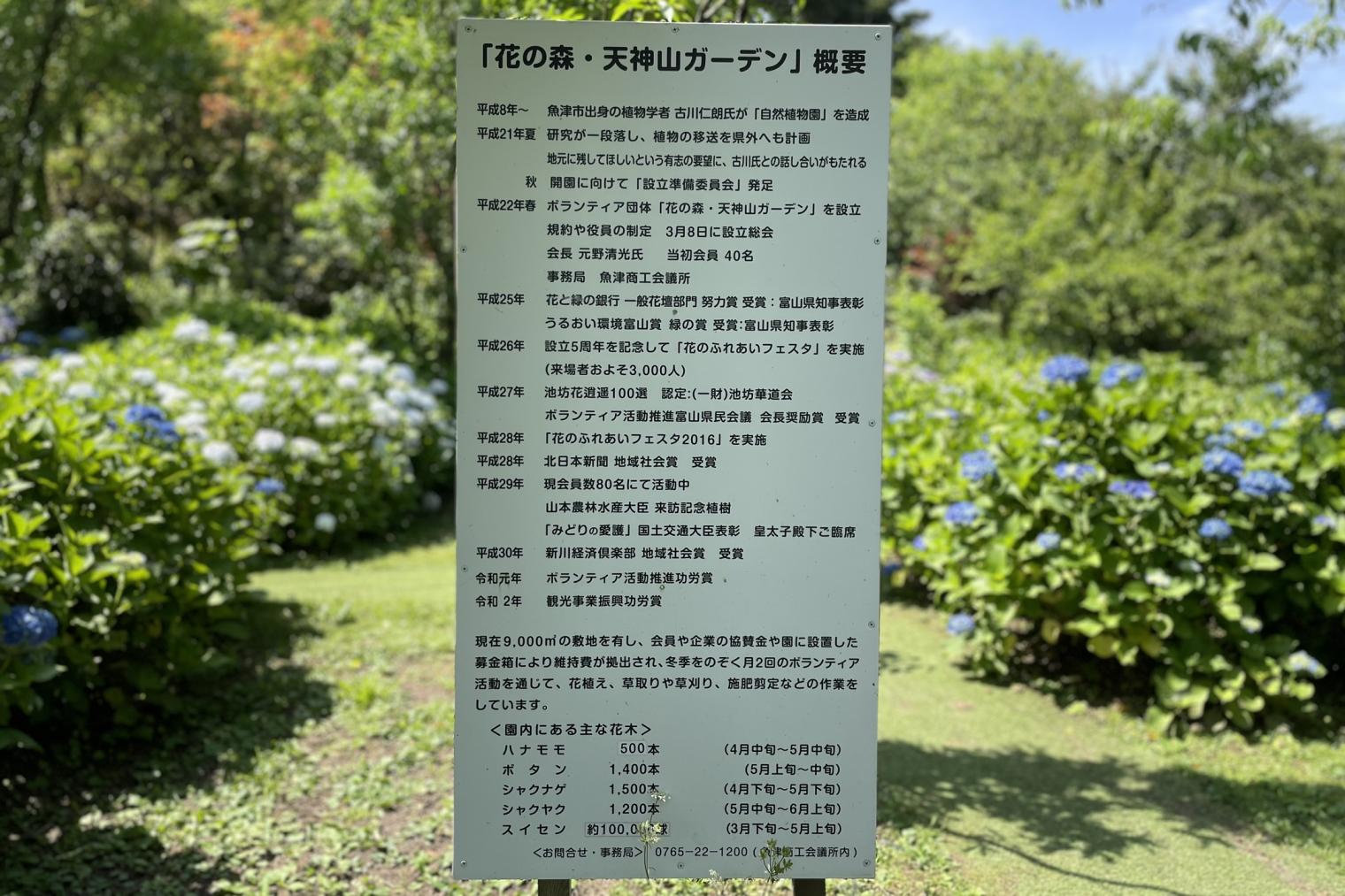 「花の森・天神山ガーデン」は、「天神山」という里山にある自然植物園です。もともとは1996年から魚津市出身の植物学者、古川仁朗(ふるかわじんろう)さんが研究のために作った植物園でした。その研究がひと段落した際に「ぜひ地元に残してほしい」と有志がお願いし、それが叶って2010年からボランティア団体「花の森・天神山ガーデン」に管理が引き継がれました。