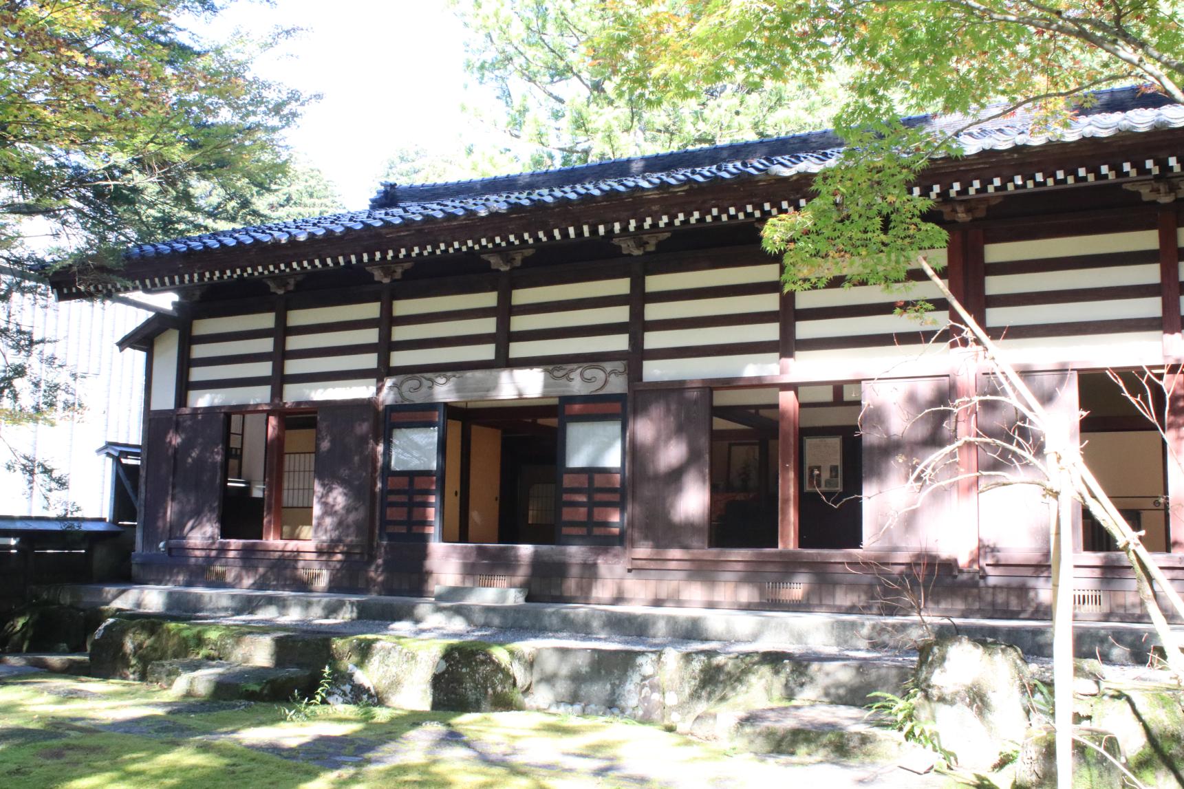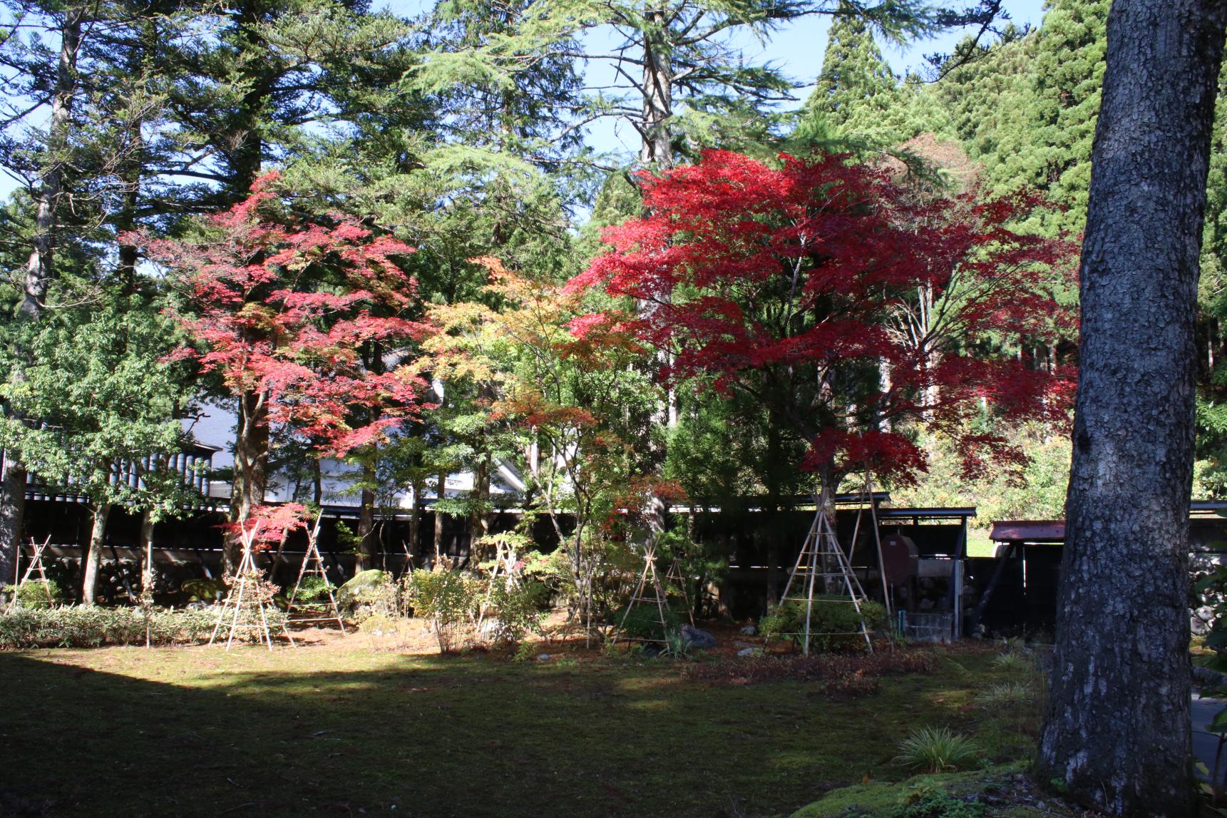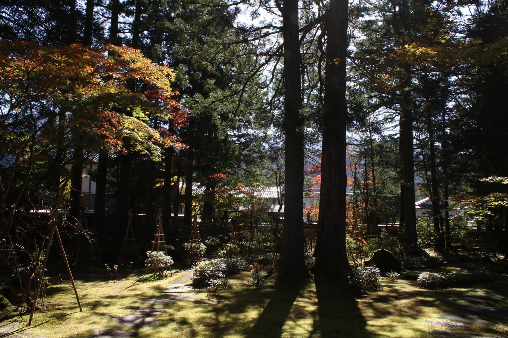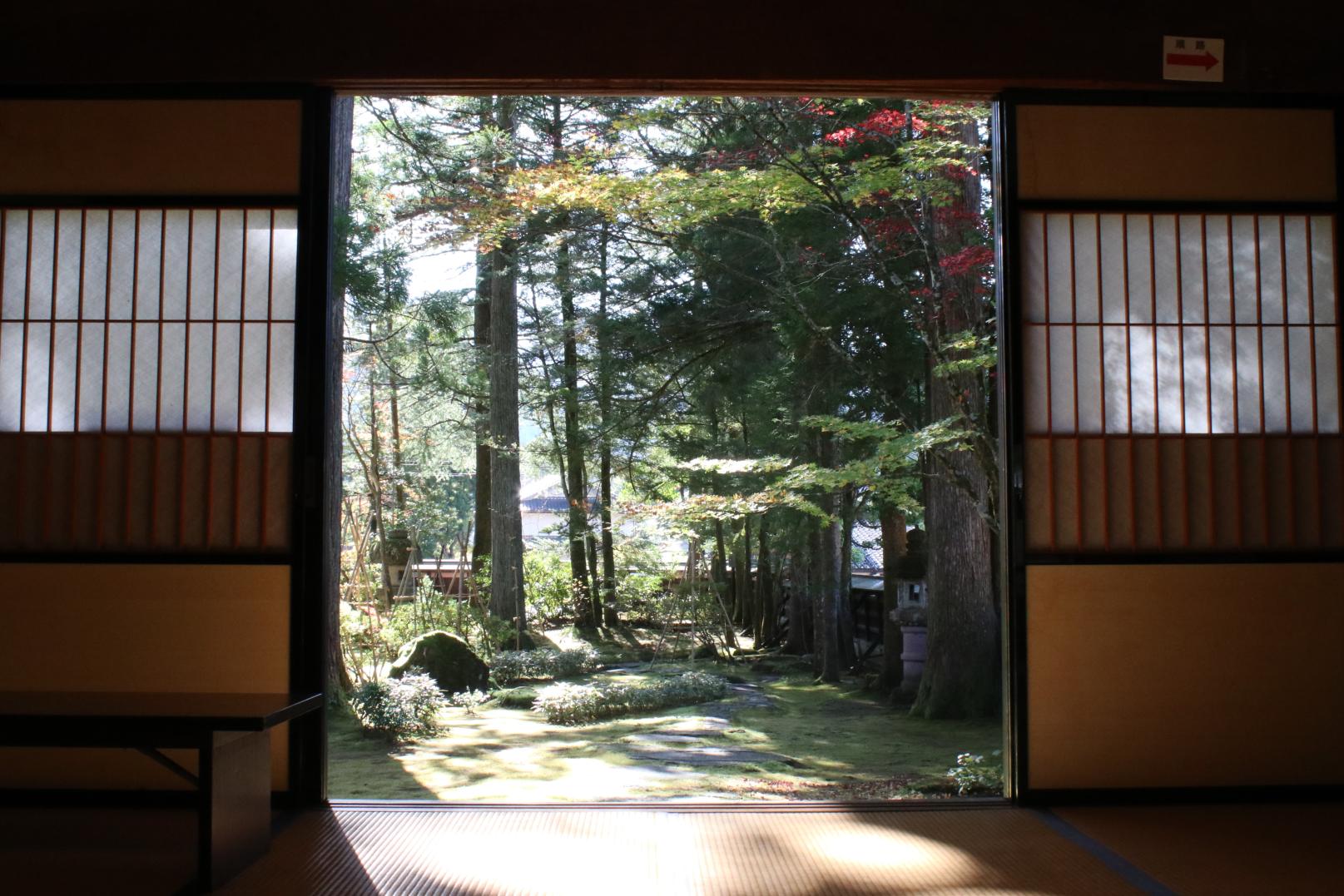 まずは当プランの企画担当者、松田ゆかりさんイチオシの「教算坊(きょうさんぼう)」へ。何度もこの場所を訪れている松田さんが特にお気に入りのスポットは、庭園に面した建物の一角。中から庭園を撮るのがおすすめで、1枚目のような写真が撮影できます。また、特に紅葉の時期はこの下の写真のような風景が広がるので素敵です。