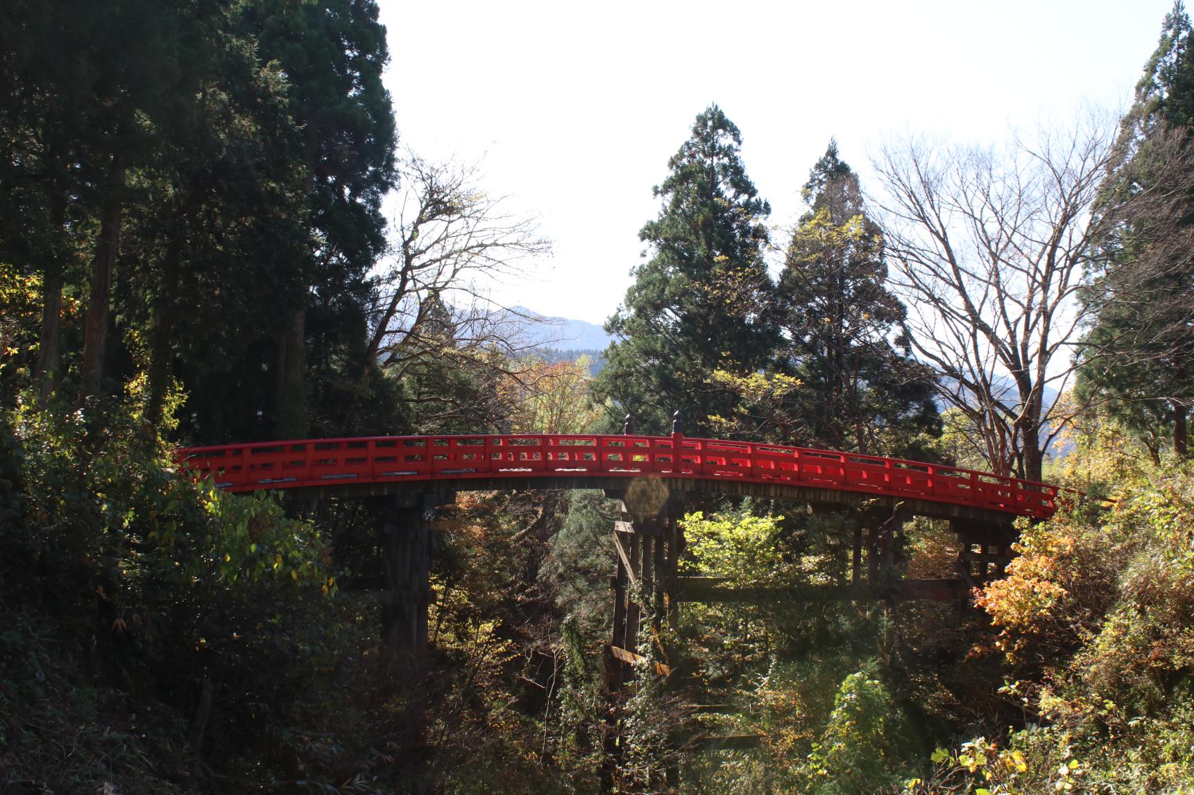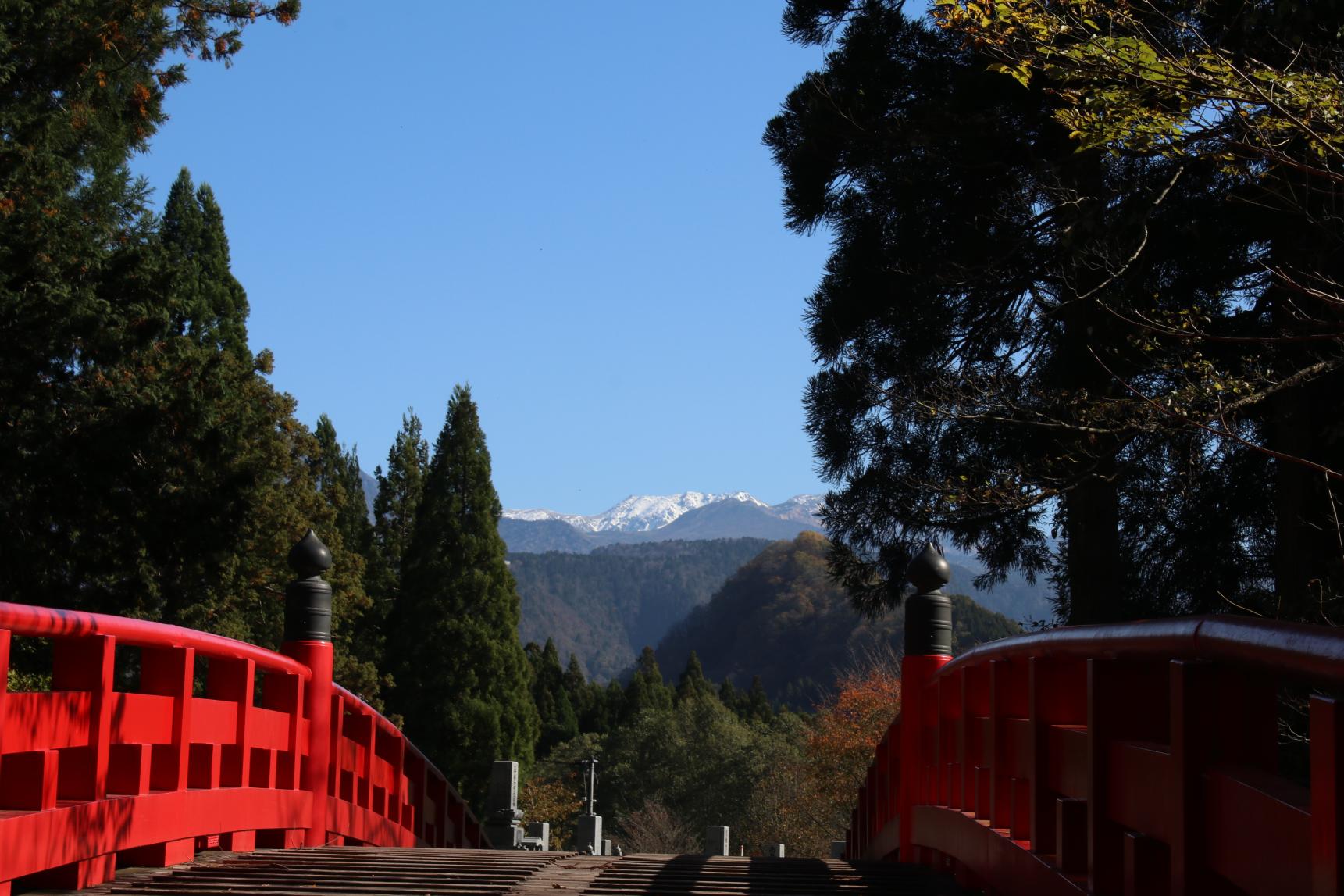 「布橋」は、女性に向けた立山信仰の舞台。江戸時代、山岳信仰の対象だった立山は女人禁制でした。そこで、立山に登る男性と同じように極楽往生にいきたい、と願う女性たちを救うための伝統儀式「布橋灌頂会(ぬのはしかんじょうえ)」が開催されました。この儀式は明治に入り一度は廃れたものの、1996年に約130年ぶりに癒しの儀式として復活。現在は3年に1度、開催されています。「布橋」の先には美しい立山連峰が見えます。訪れた日はとても良い天気だったので、雪化粧をまとった姿を橋から臨むことができました。橋自体もとても美しい形をしているので、撮影スポットとしても人気です。