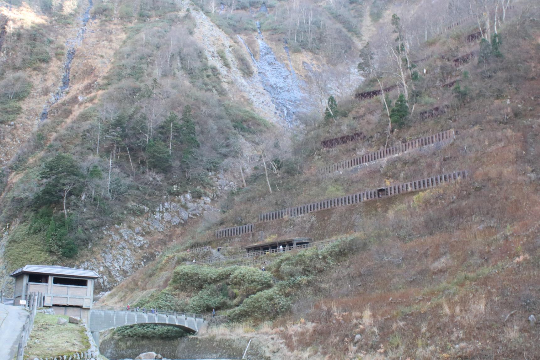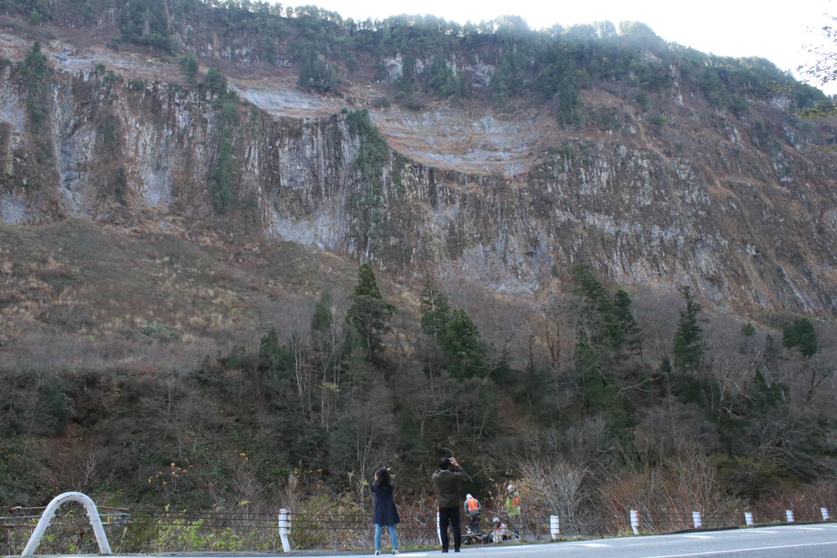 称名滝に行くまでの道には「悪城の壁(あくしろのかべ)」という壮大な岸壁があるのですが、今回は入部さんおすすめの場所から見ることができました。私は称名滝には何度か行ったことがあるのですが、「悪城の壁」はバスの車内から見たことしかなかったので、至近距離から見てみてその大きさを実感することができました。