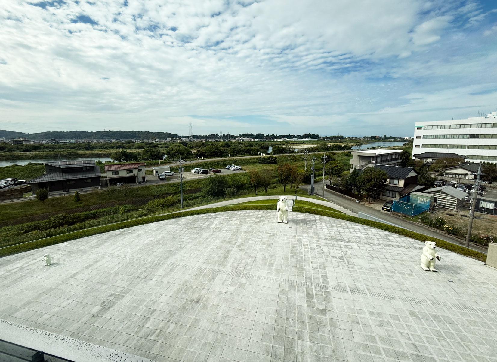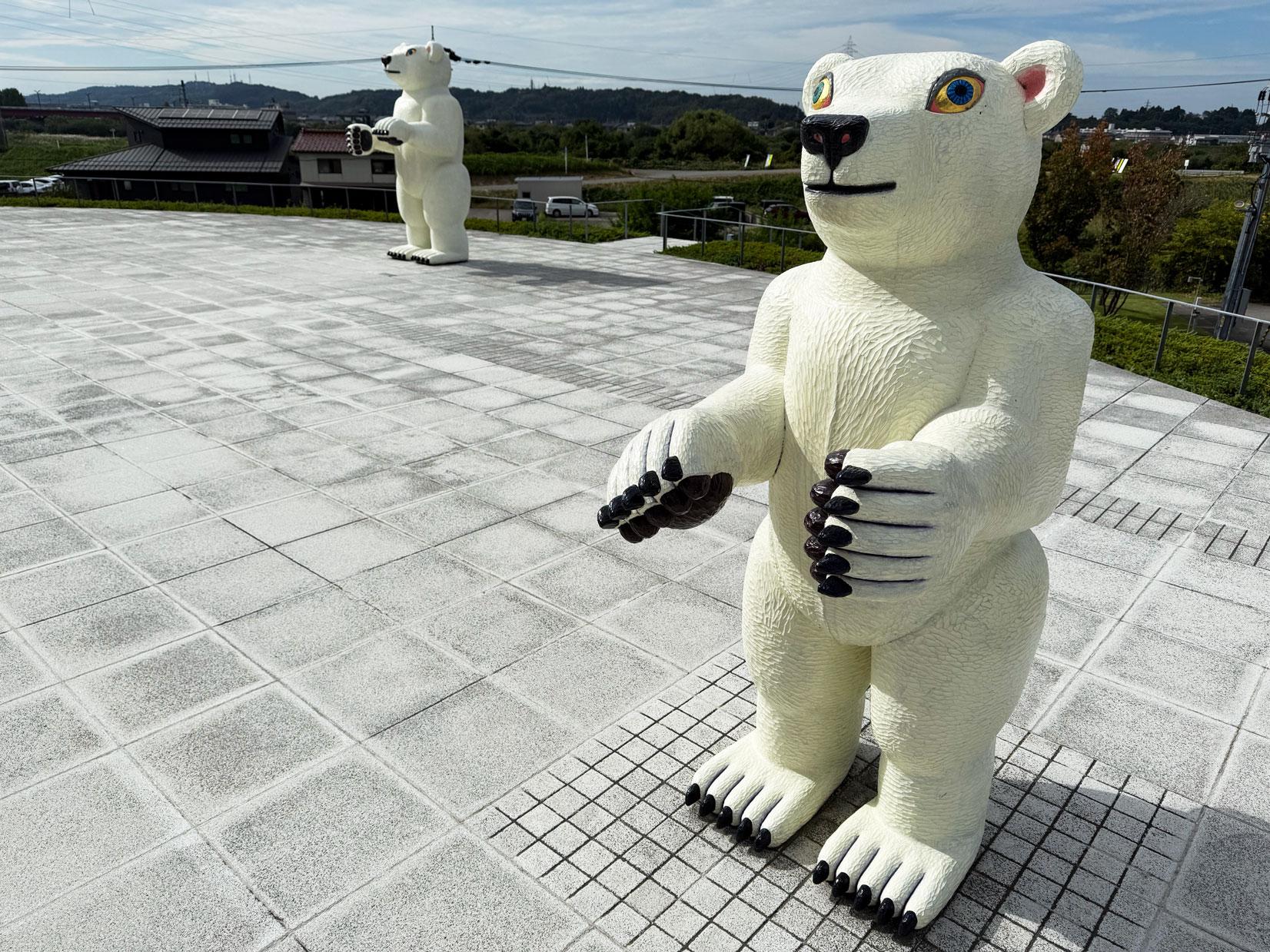 ホワイエから西側に歩いていくと、屋内に1匹、屋外広場には3匹の白いクマがあります。