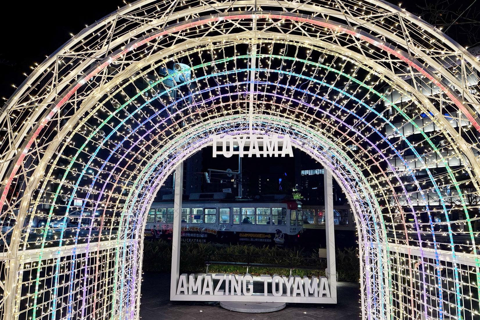 光のアーチとAMAZING TOYAMAのフレームのフォトスポットでは、富山名物の市電とイルミネーションの写真が撮れます。
