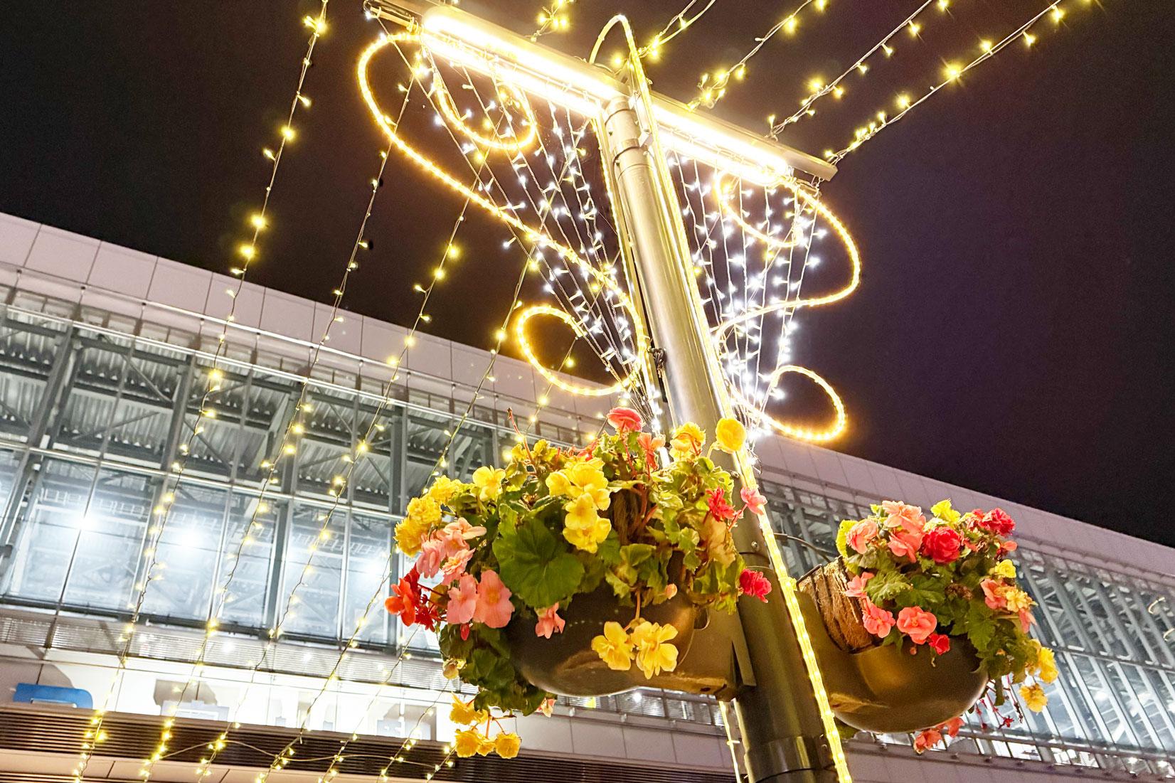 意外と見落としがちなのが、イルミネーションの支柱に飾られている花々です。