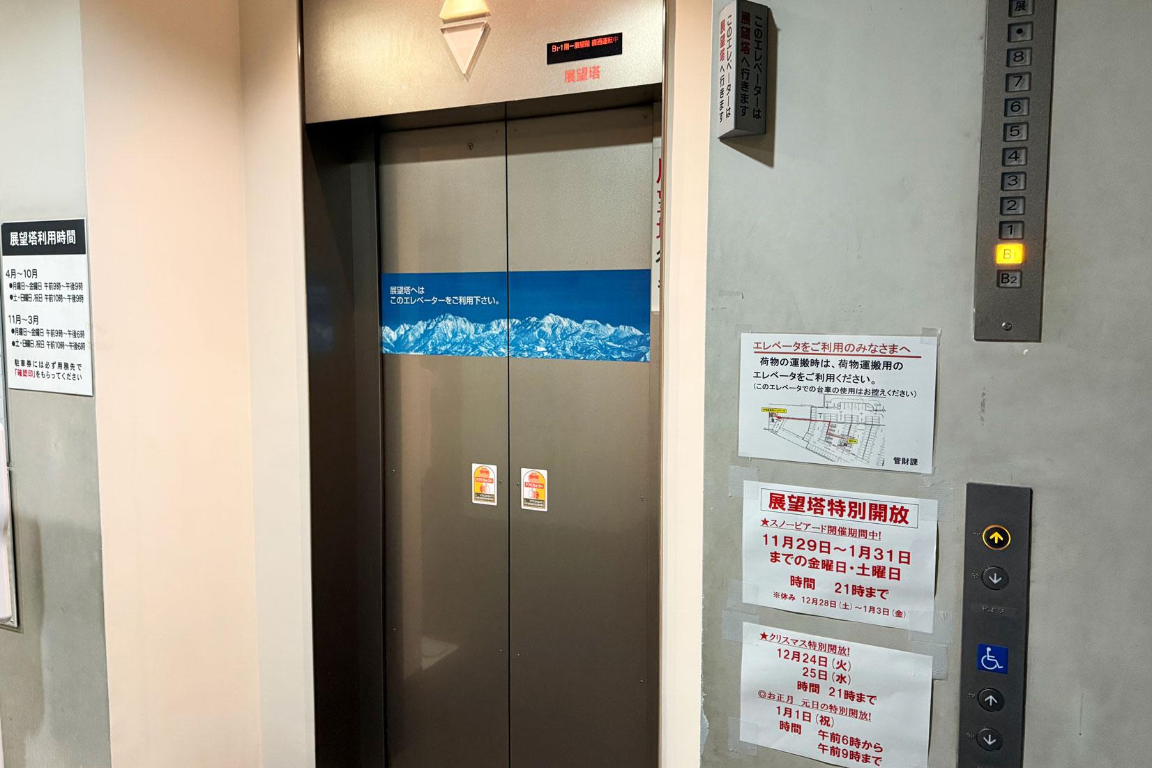 市役所のエレベーターは4つあるのですが、展望塔まで行くのは1基のみ。この写真のエレベーターだけなので、事前に頭に入れておいてください。