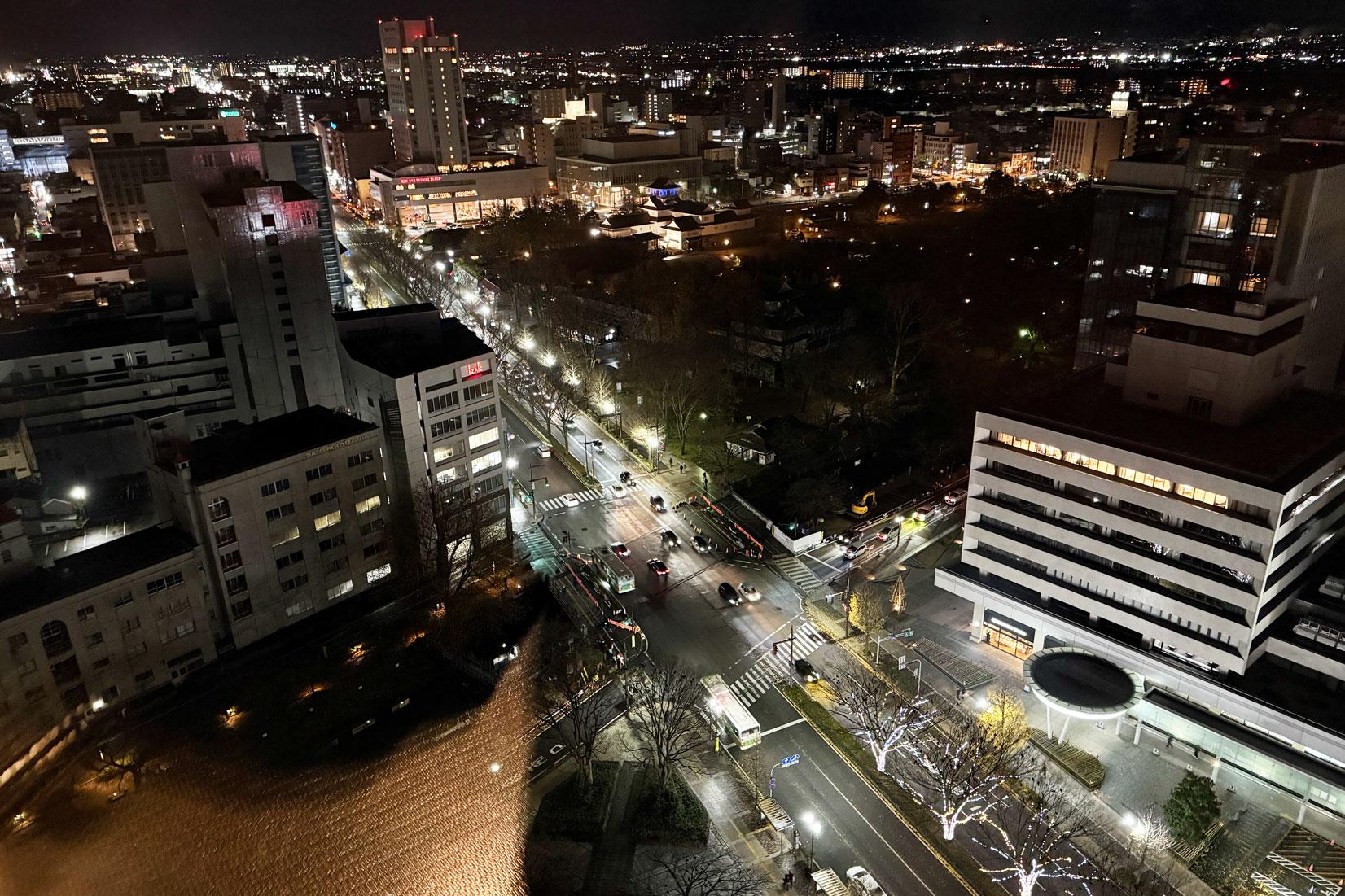 2024年11月29日〜2025年1月31日の期間中の金・土曜、12月24日(火)、25日(水)は、21時まで夜間延長開放を行っているので、地上約70mからホワイトイルミネーションとやまを見渡せます。