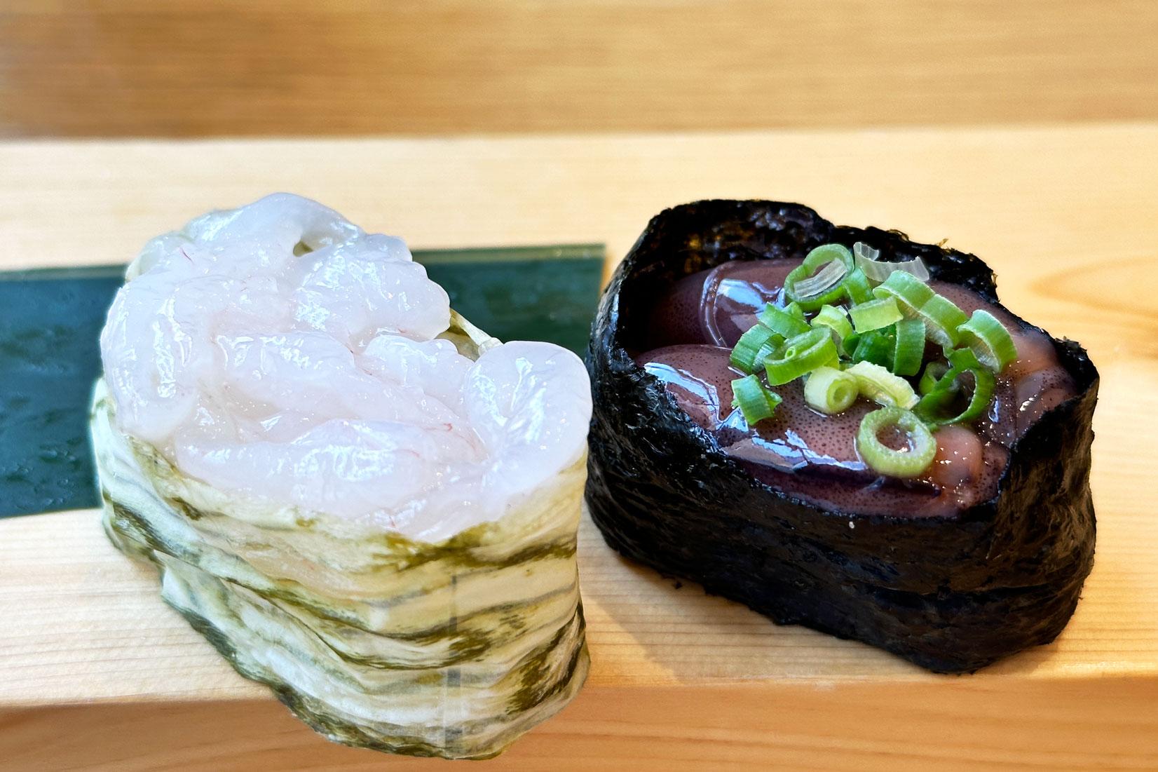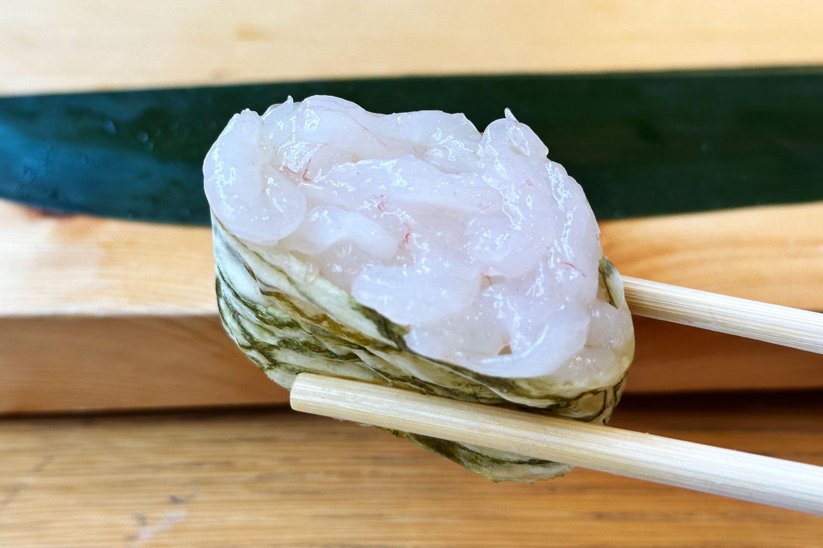 富山湾の宝石とよばれる「白エビ」の軍艦巻きです。