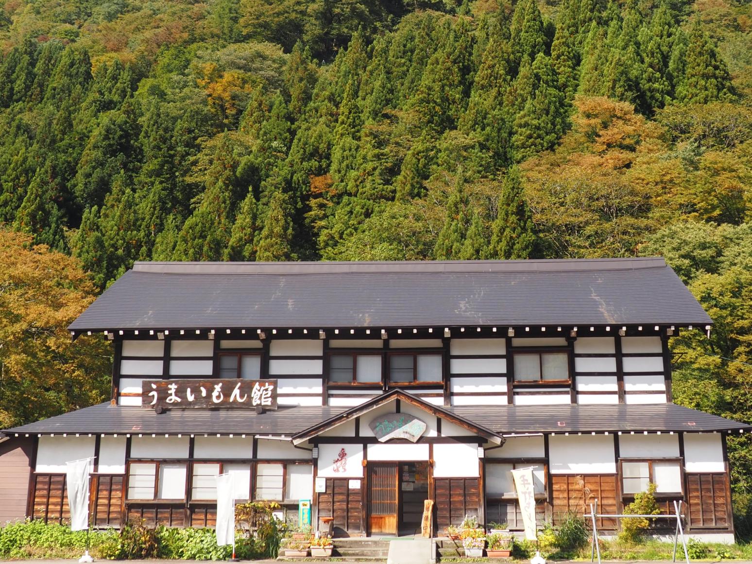そば打ち体験をするのは「うまいもん館」の横にある「そば工房」。工房内は大きなガラス窓で囲まれており、四季折々の自然を間近に感じながらそば打ちができる。