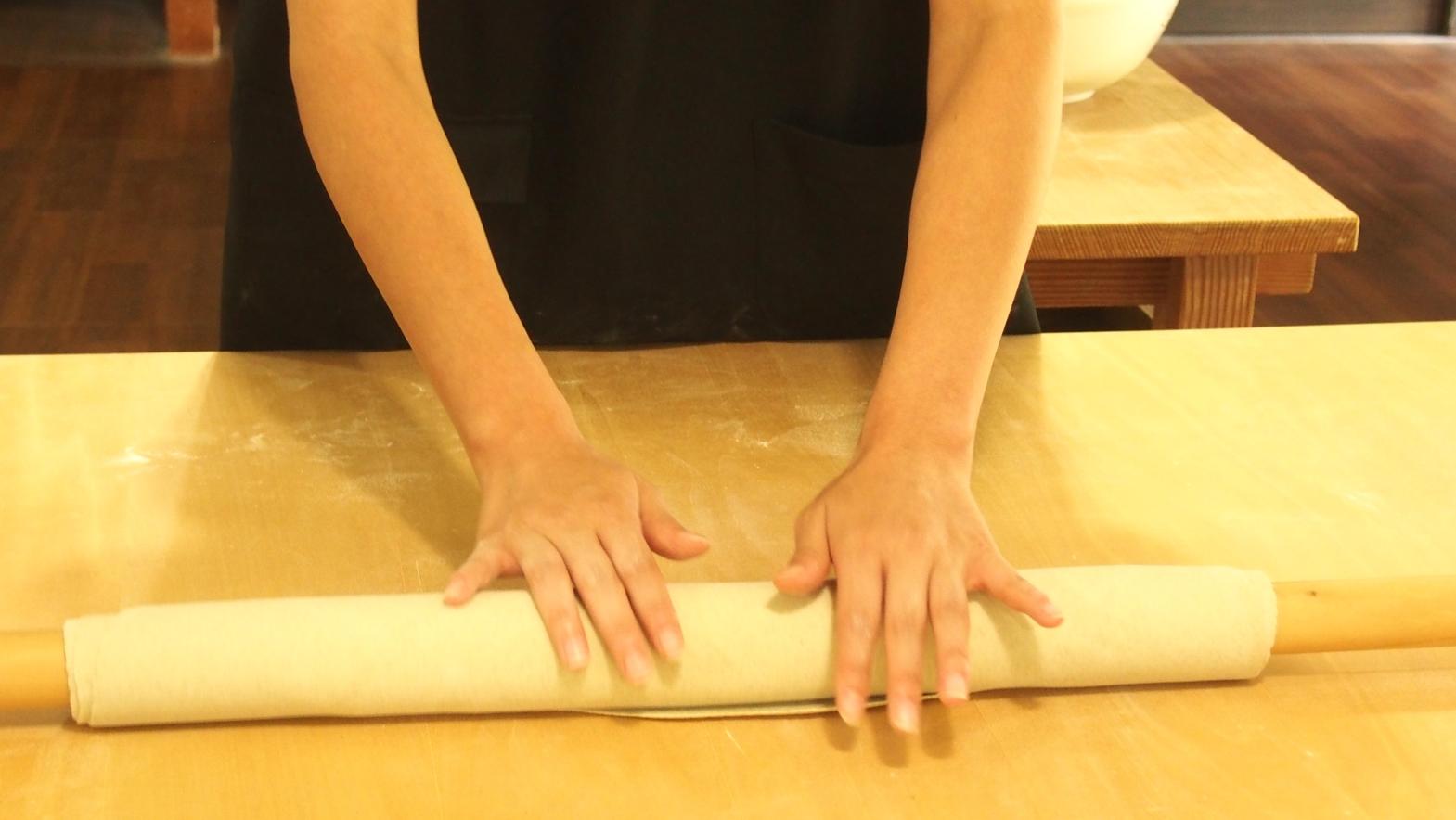 生地を十分に練り上げたら、1m近くもある大きな麺棒を使って生地を薄く薄く伸ばしていく。お手本で見せてもらう職人の手元では、生地の上で麺棒がすーっとなめらかに滑り、とても美しい。