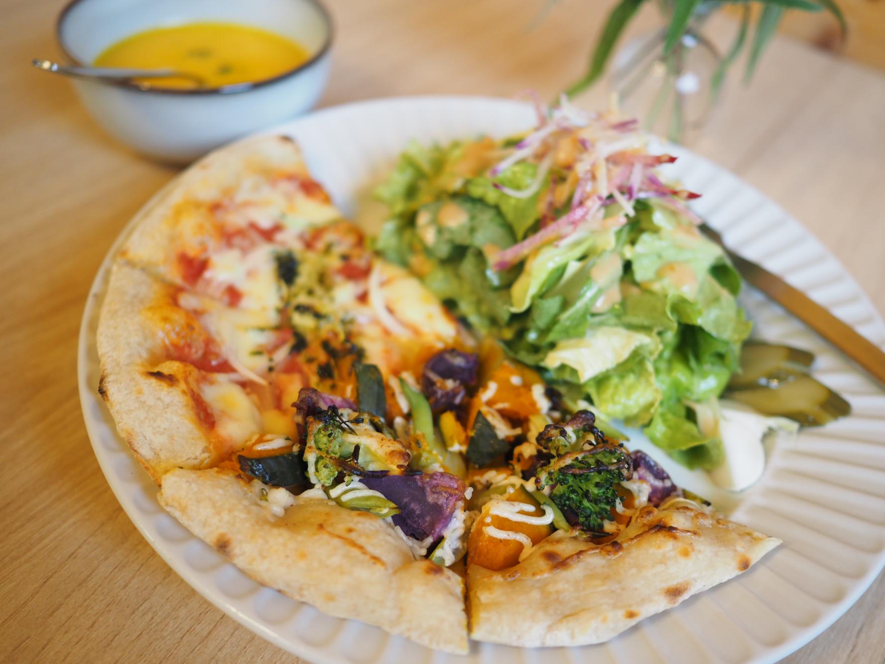 いろいろな種類のパンが楽しめる「プレートランチ」や、旬の野菜をふんだんに使ったビザが食べられる「ピザランチ」など、ランチメニューも人気。