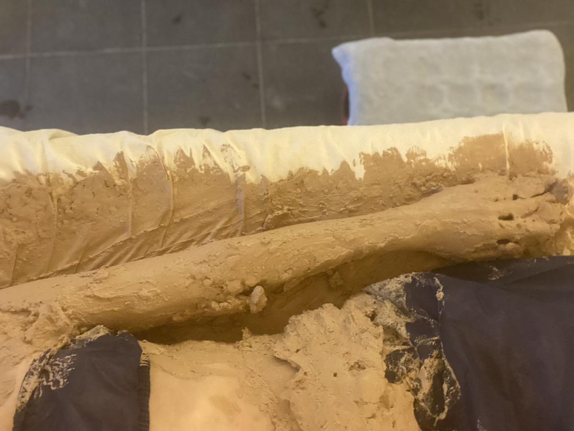 エステティシャンの方が準備している様子を見てびっくり!台の上に大胆に泥が敷かれていきます。特に泥が多く敷かれている部位が、私が不調を伝えた肩回りです。