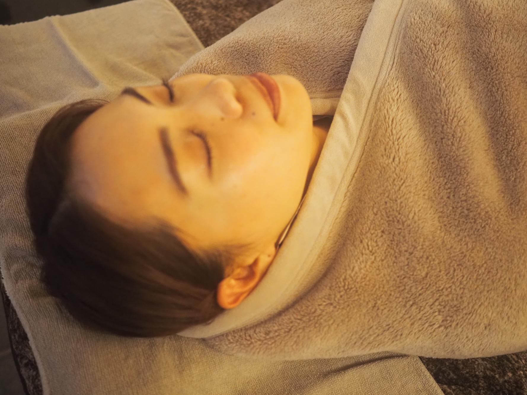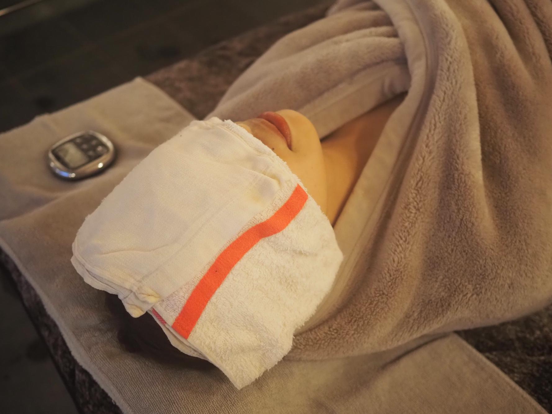時間が経つと、かなり体が熱くなってきますが、そこはさすが三楽園さん!数分おきに目元に冷たいタオルを置いていただいたおかげで、体は熱いけれど、頭はすっきりして、心地よい時間を過ごせました。