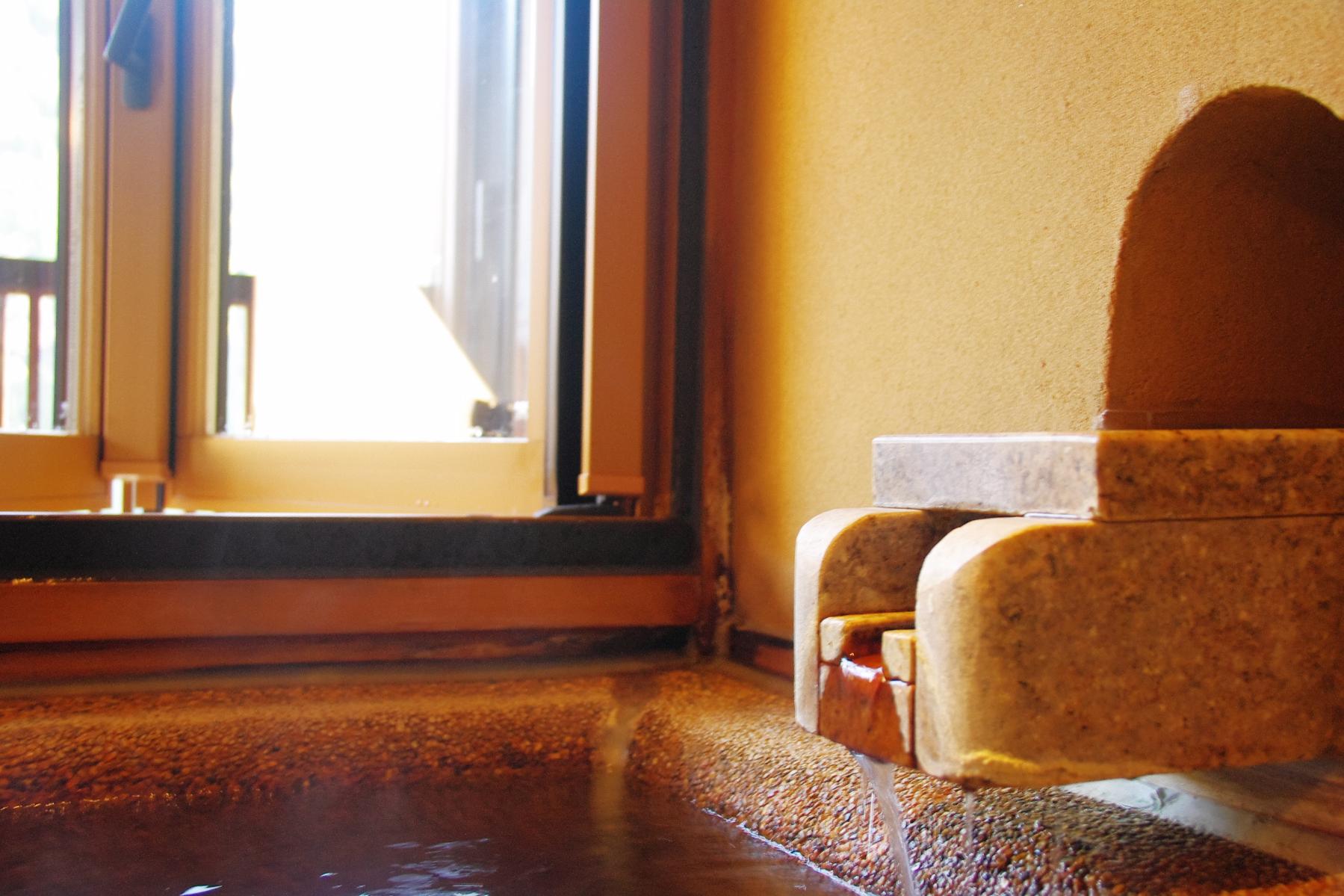 赤茶色のにごり湯は「鳥越の湯」の由来となった、傷や婦人科疾患への効能が高い天然温泉。このお湯に入れるのは庄川温泉の中でも三楽園だけだそうです。