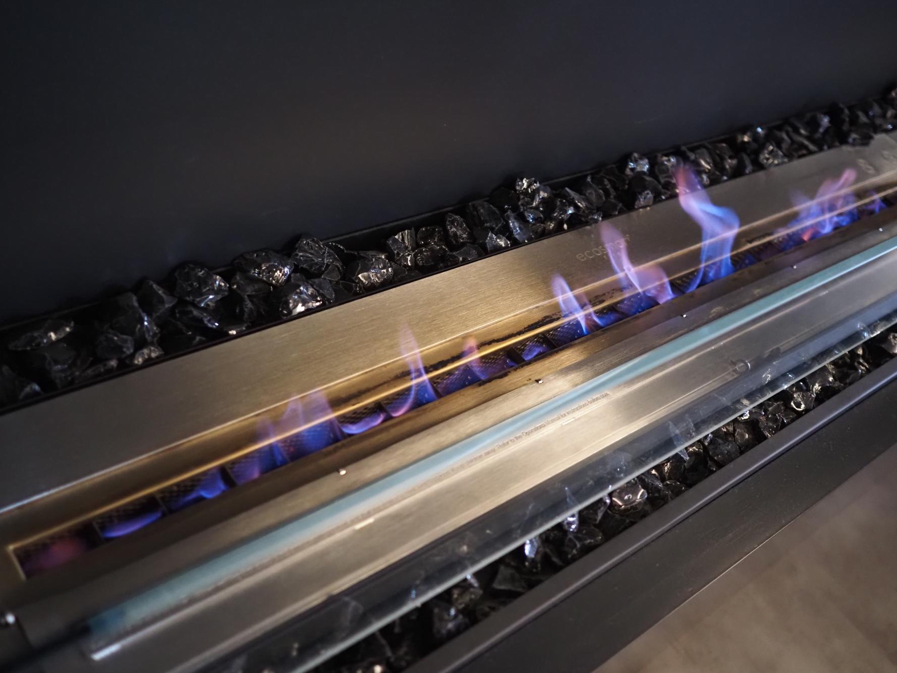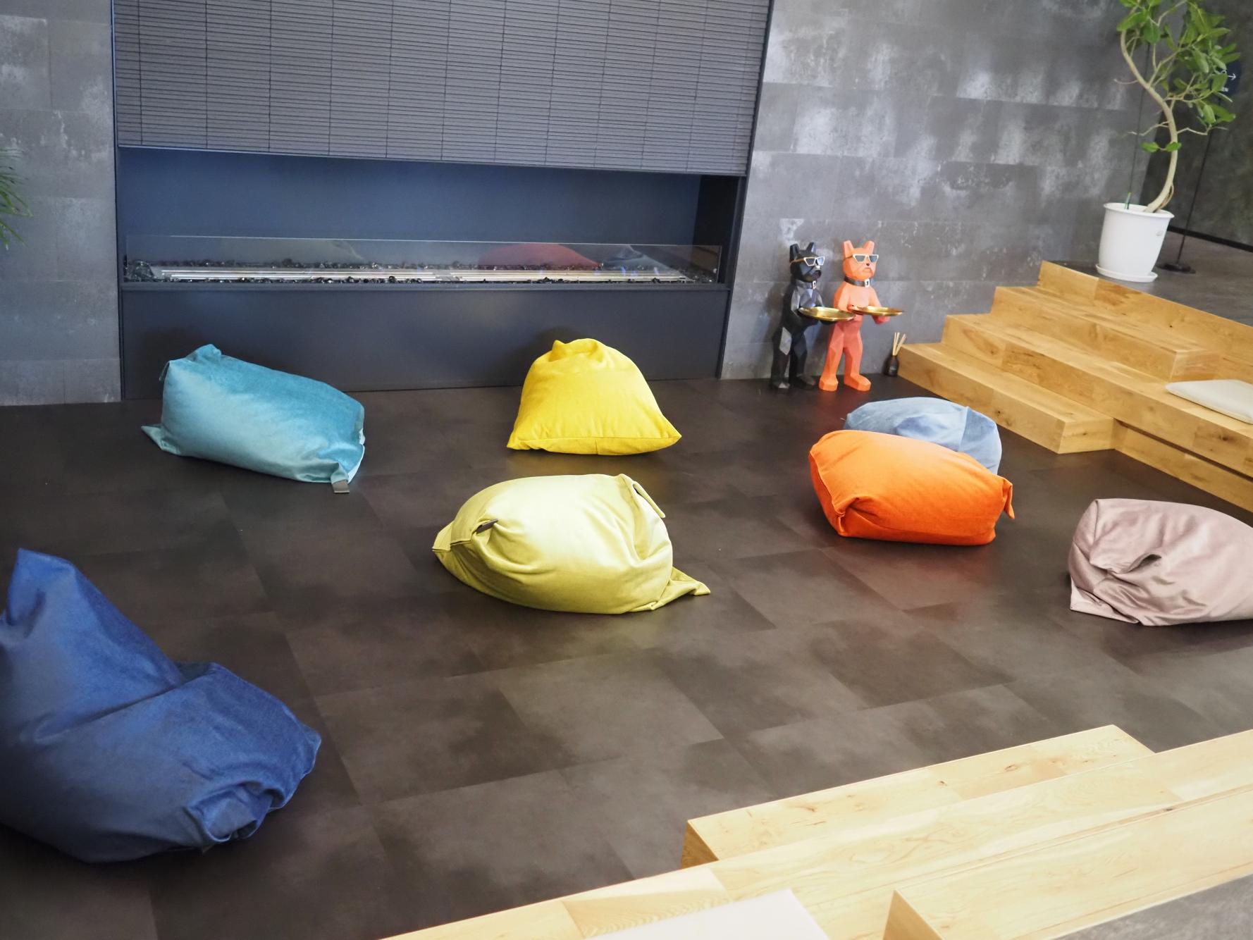 中央に位置するフリースペースには、カラフルでかわいいクッションたちがお出迎え。壁に組み込まれたバイオエタノール暖炉の火も、こだわりのおしゃれな空間づくりにの立役者になっています。