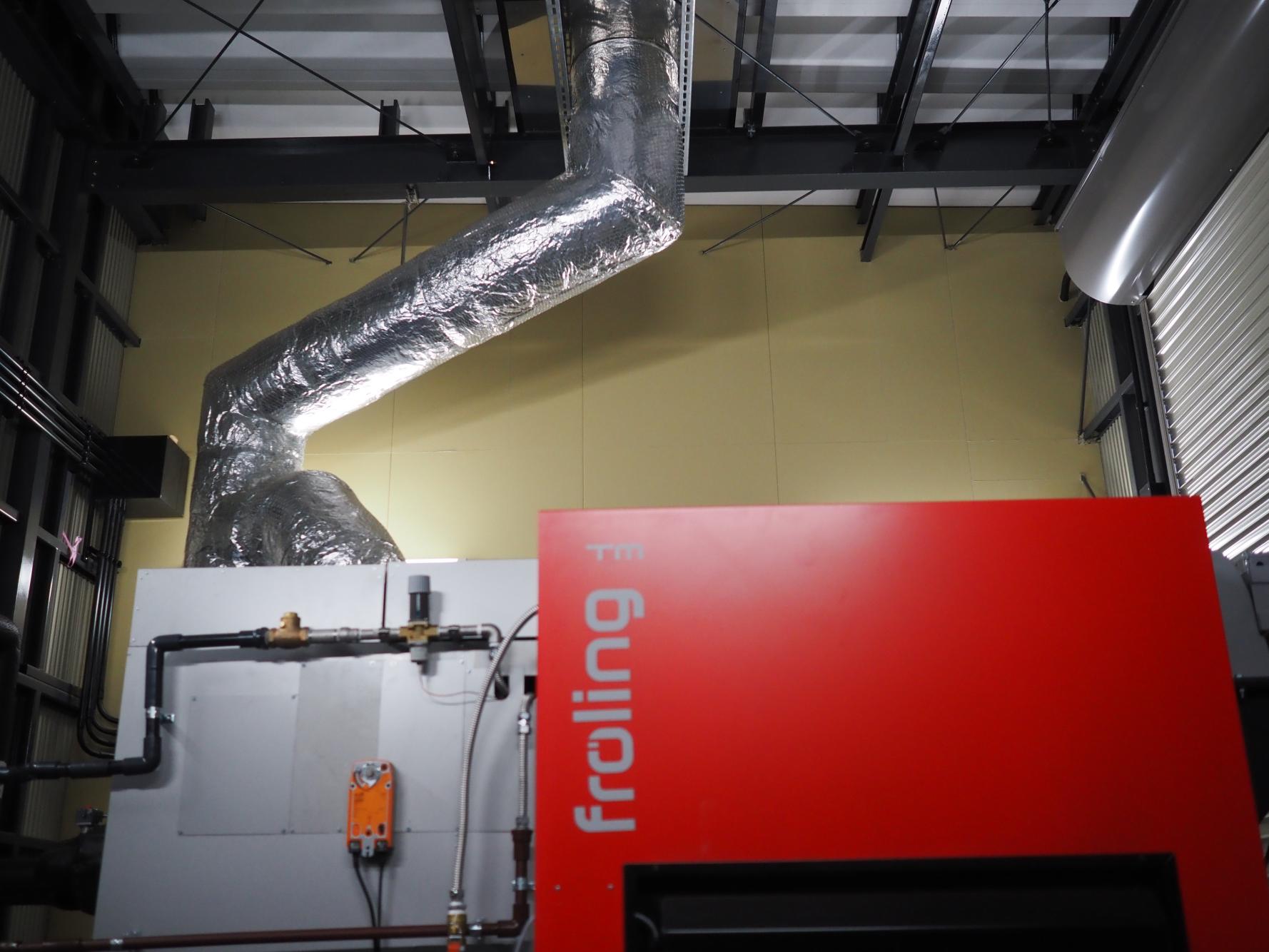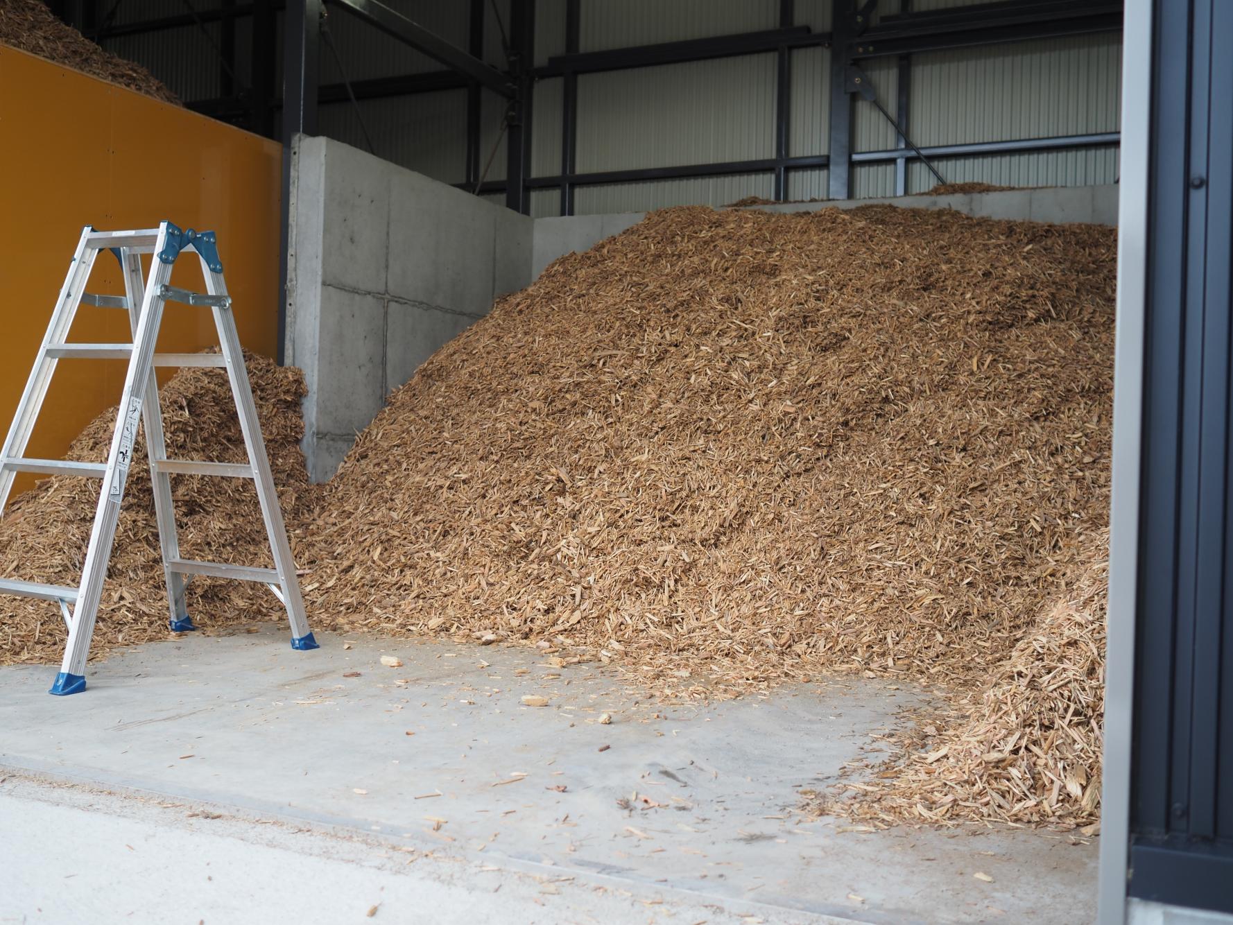施設の左奥には、木材チップを保管しておく倉庫や、それらを燃やすボイラーが。富山県内での伐採が多い生木でも、十分に燃やすことができる、オーストリア製のボイラーを取り入れ、効率的にお湯をあたためています。