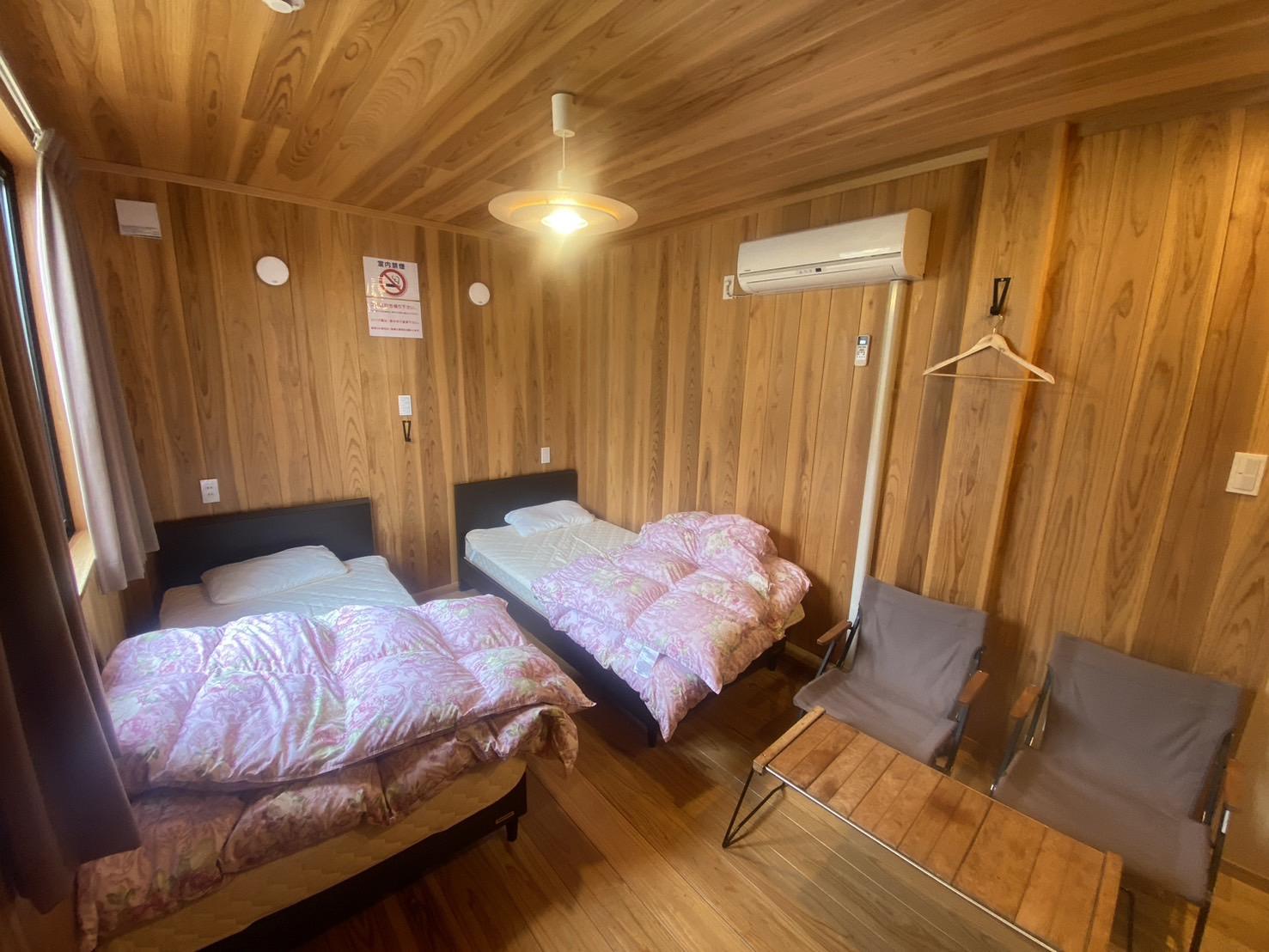 ベニヤ合板で作られたシンプルな造りで、中はマットレスベットやテーブルとイスのみがある、静かな空間です。