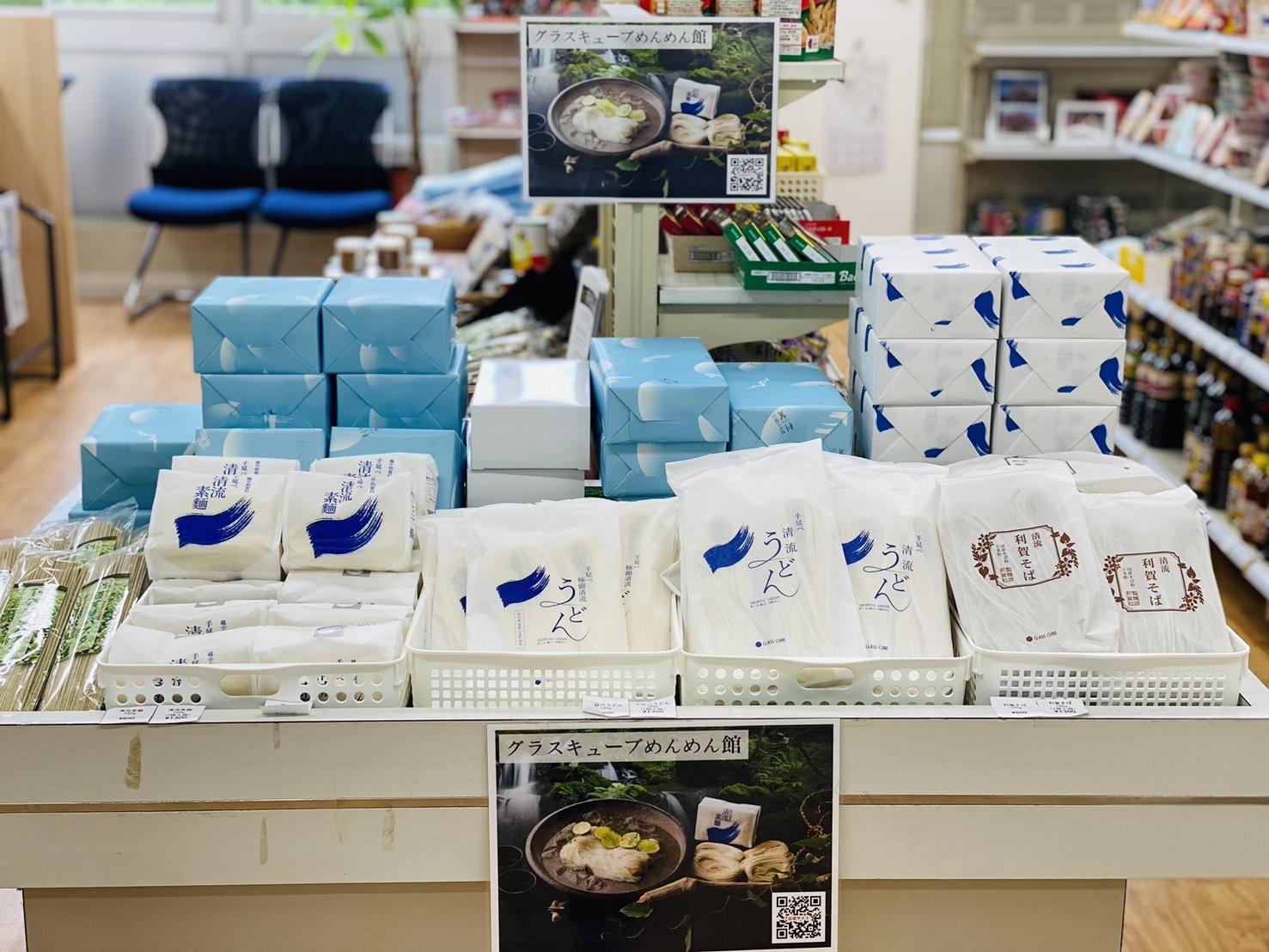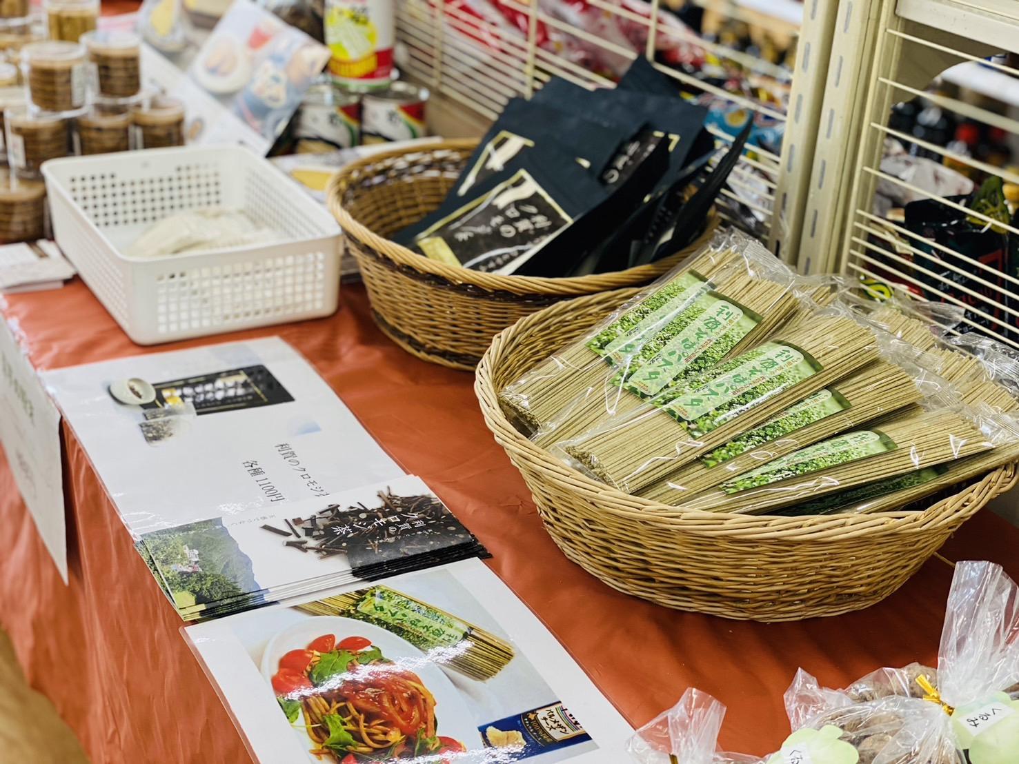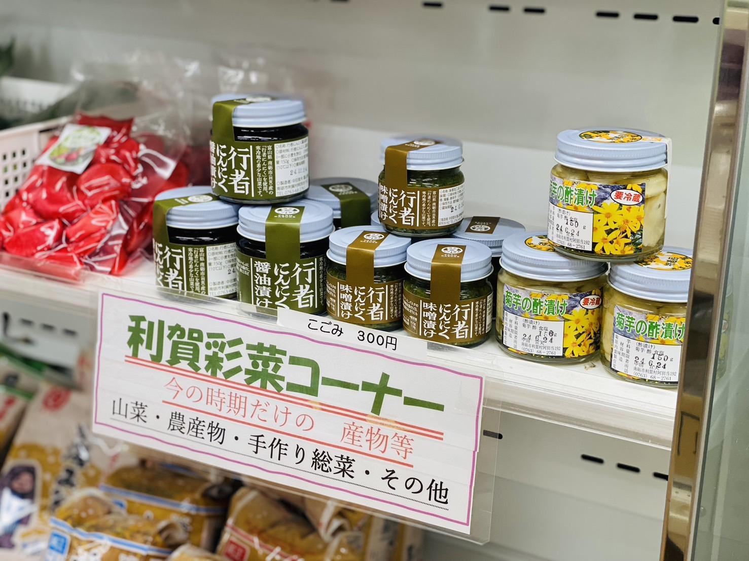 地元の農家の方々が作った漬物や山菜の加工品、特産品のそば粉を使用したそば粉パスタなど、利賀ならではの特産品が多数並んでいます。