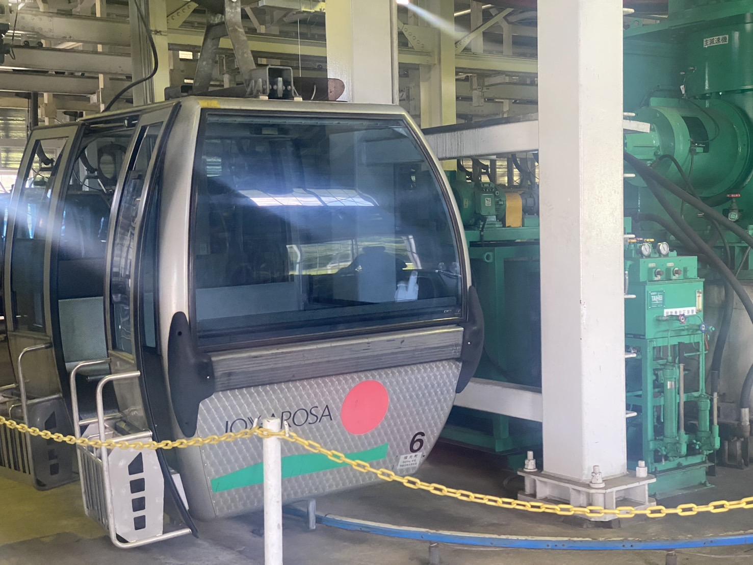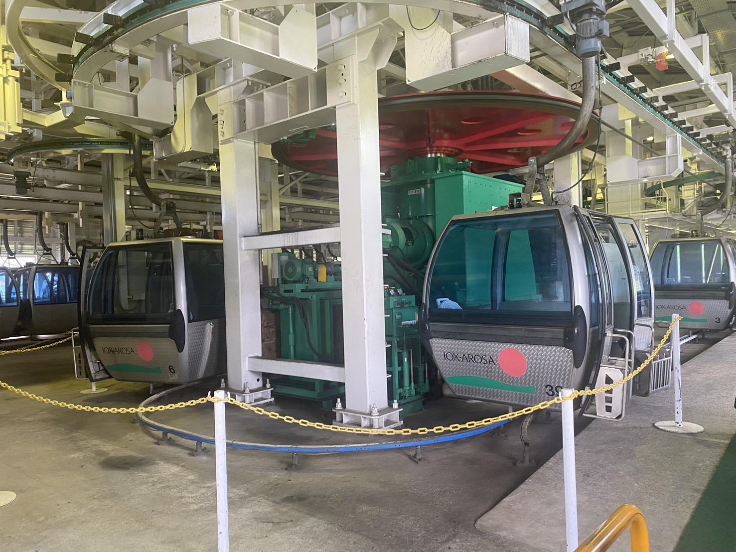 IOX-AROSAでは、山頂に行くために距離1600m、標高差400m以上の道のりを、こちらのゴンドラに乗って上っていきます。