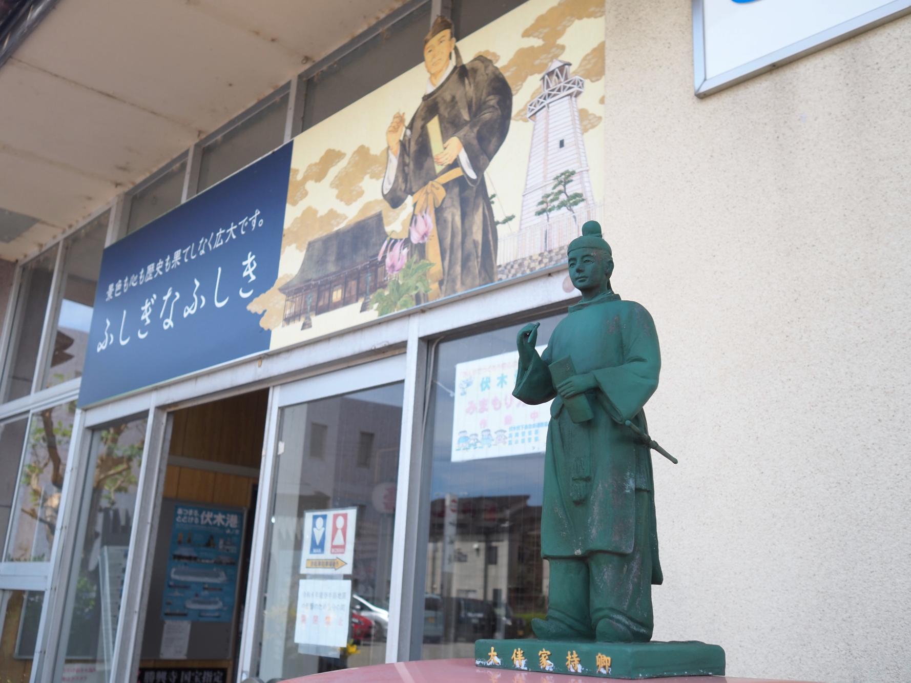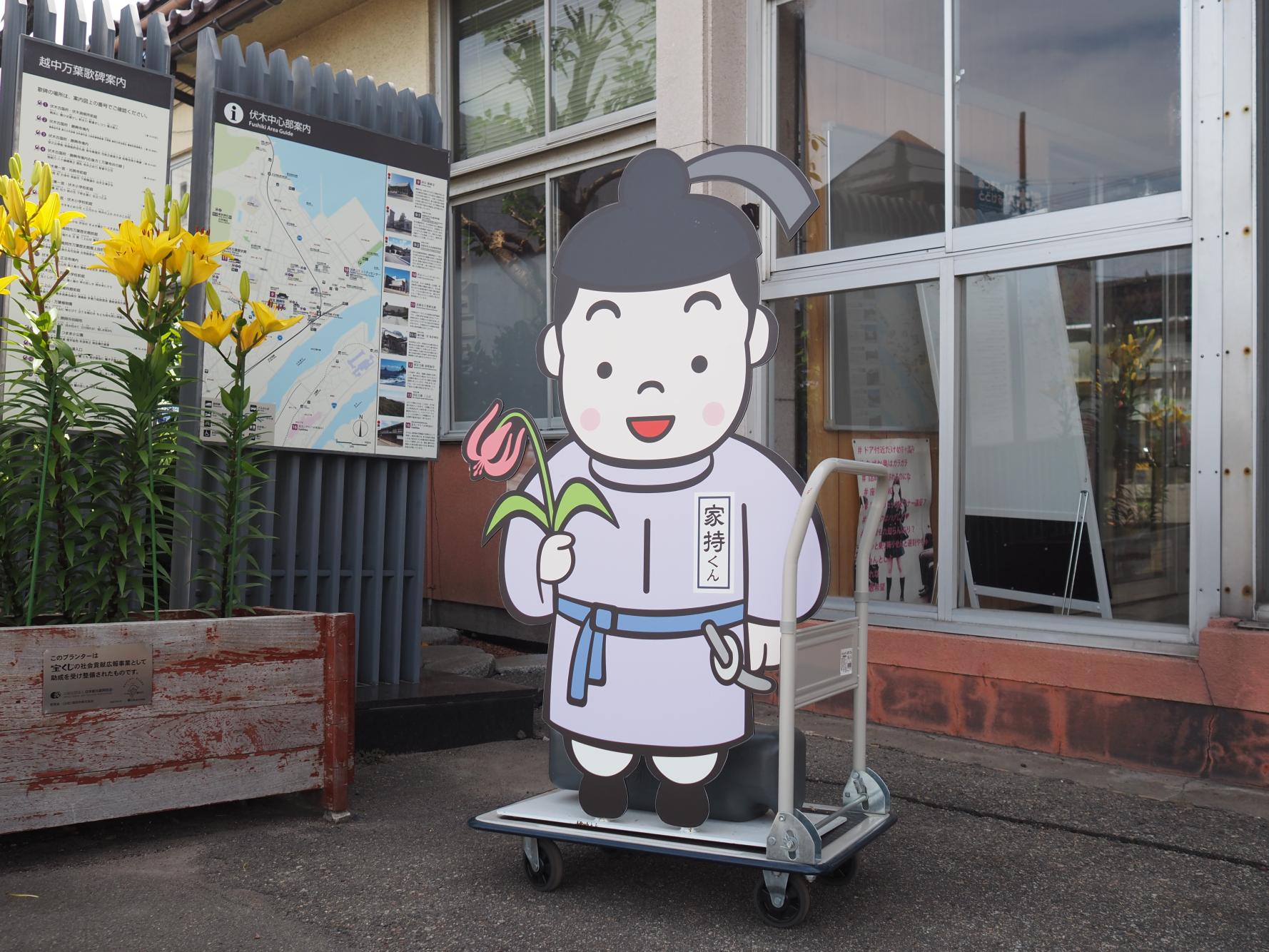 JR氷見線上にある伏木駅に降り立つと、駅の真ん前でお出迎えしてくれたのは、万葉集でおなじみの「大伴家持(おおとものやかもち)」たち。