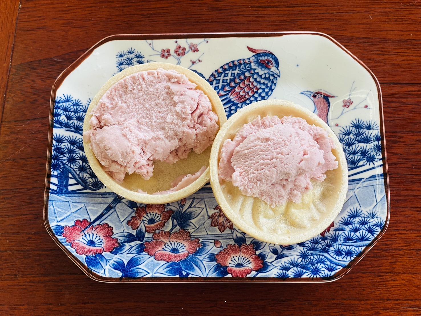 「かたかごアイス」ってことは…「カタクリ粉の味?!」と、ドキドキして食べてみると、さっぱりとしたベリーとバニラのハーモニーがとってもおいしい最中アイスでした。