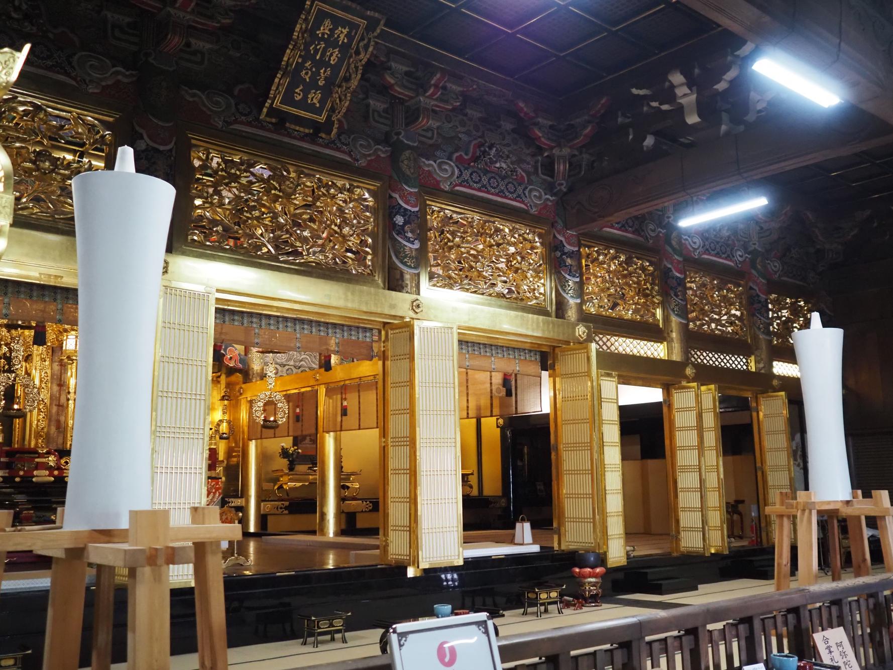 本堂の中には立派な御本尊と「デカローソク」と呼ばれる巨大なろうそくが。明治時代以降、地元の人々が競い合って大きなろうそくを奉納したため、ここまで大きくなったと言われています。