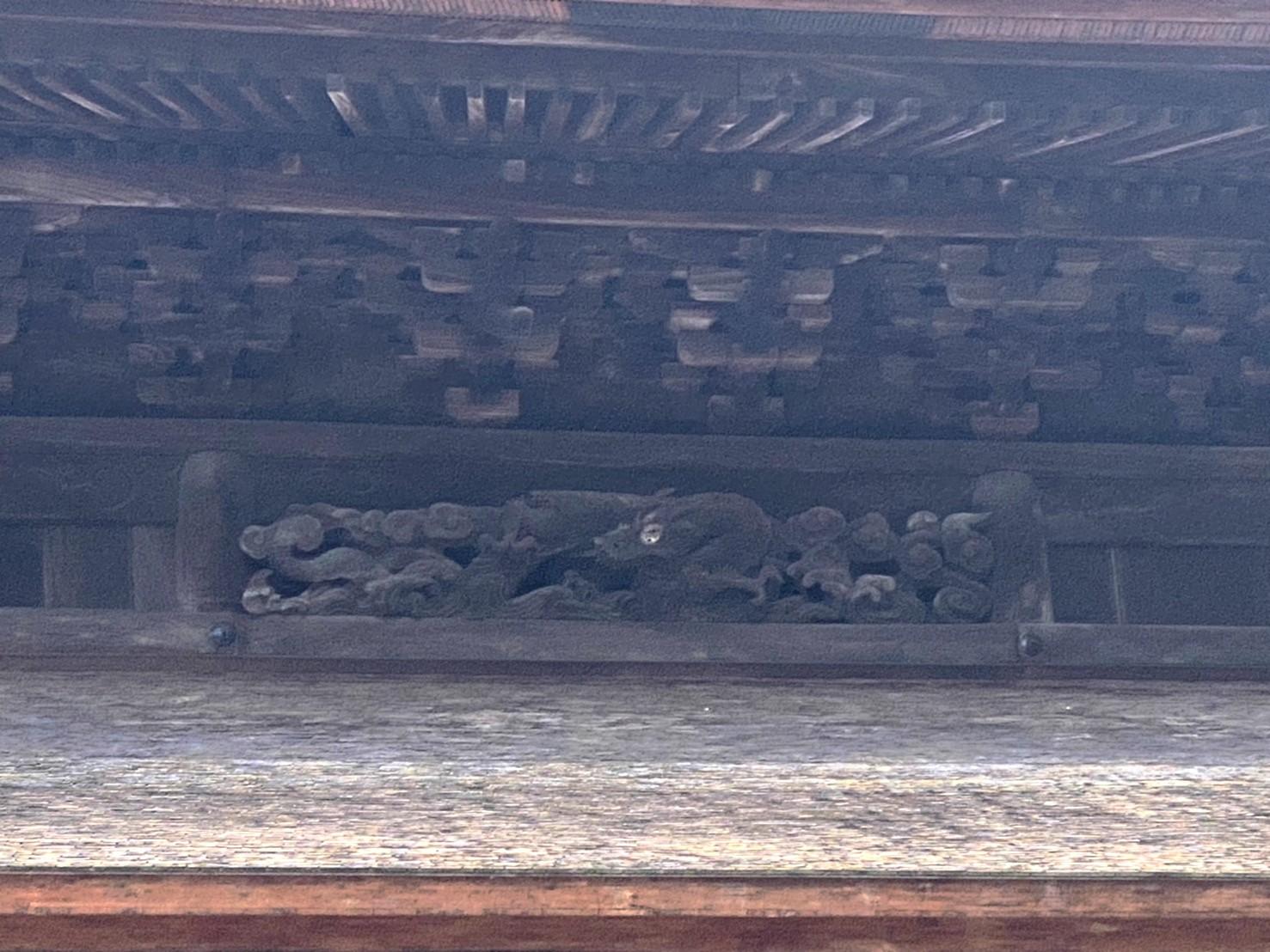 大きな屋根の隅のためなかなか見えづらいのですが、書院の中にその彫刻のレプリカが展示されています。