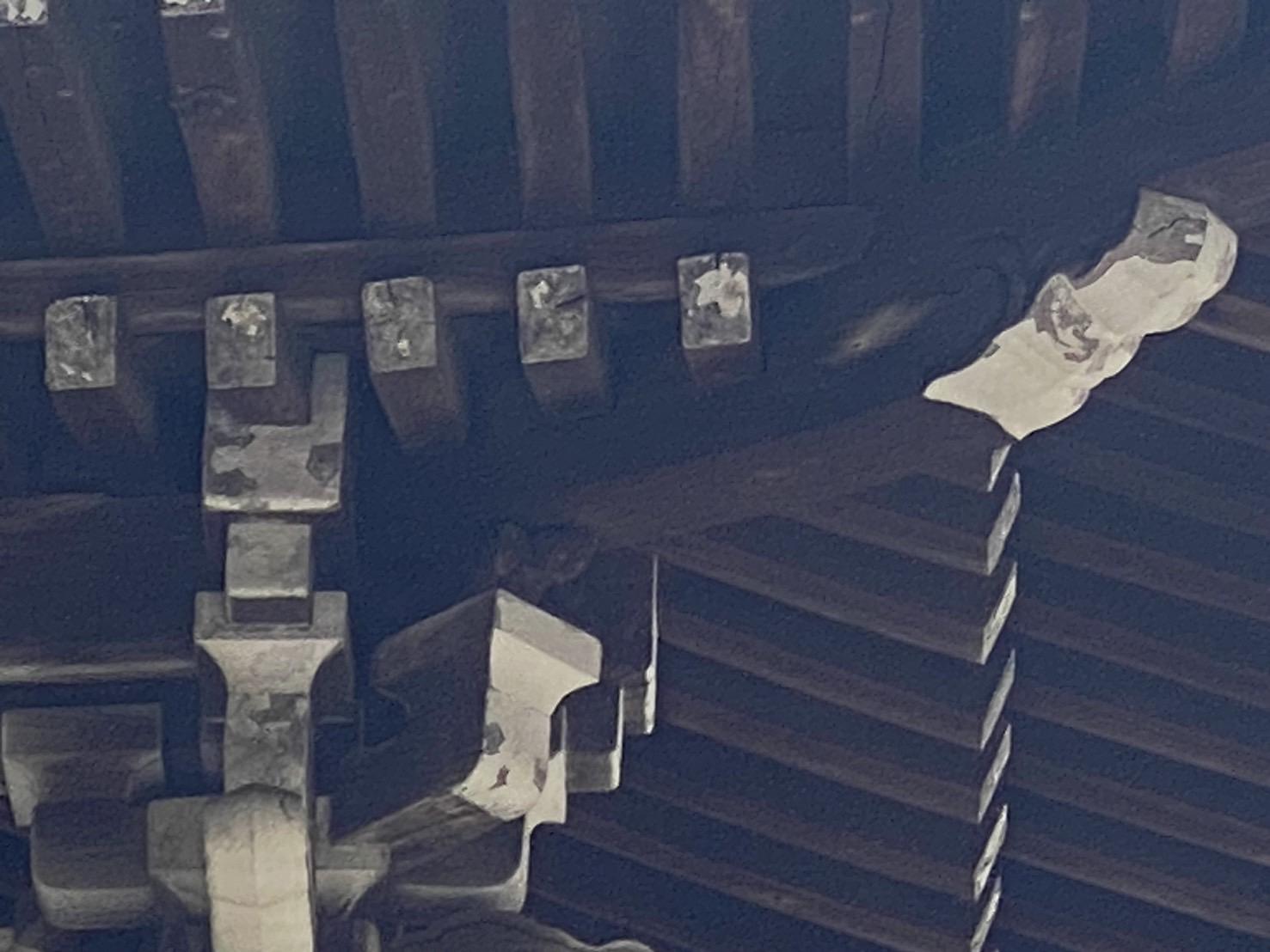 本堂を支える四つ角の柱の一番上。ちょうど軒下あたりに、屋根を支える猿(あまのじゃく)がいると言われています。