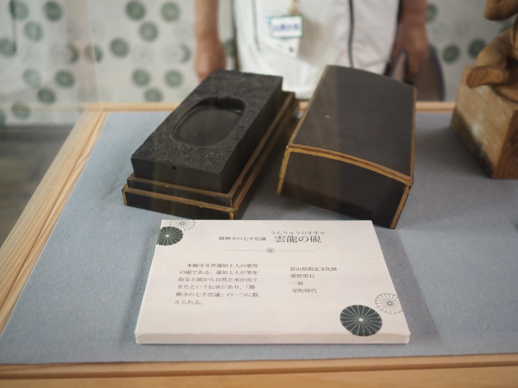 蓮如上人(れんにょしょうにん)が愛用していたと言われる一品で、書いても書いても水がわき出てくる不思議な硯だったそう。実際は、中に水を仕込んでおく部分があり、当時の便利グッズだったのかもしれません。
