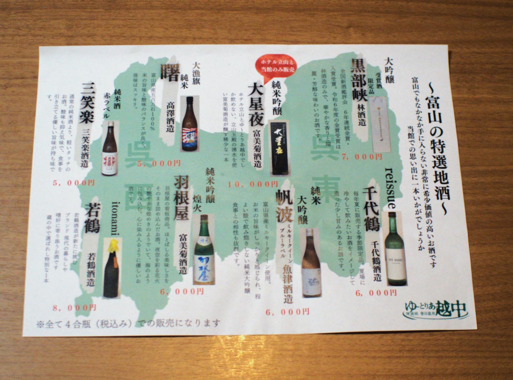 お酒の種類も充実しています。地元富山の特別な地酒をオーダーした際は、銘柄に合わせた特別な酒器でいただけるそう。どの銘柄で、どの酒器が用意されるか、想像するのも楽しいですね!