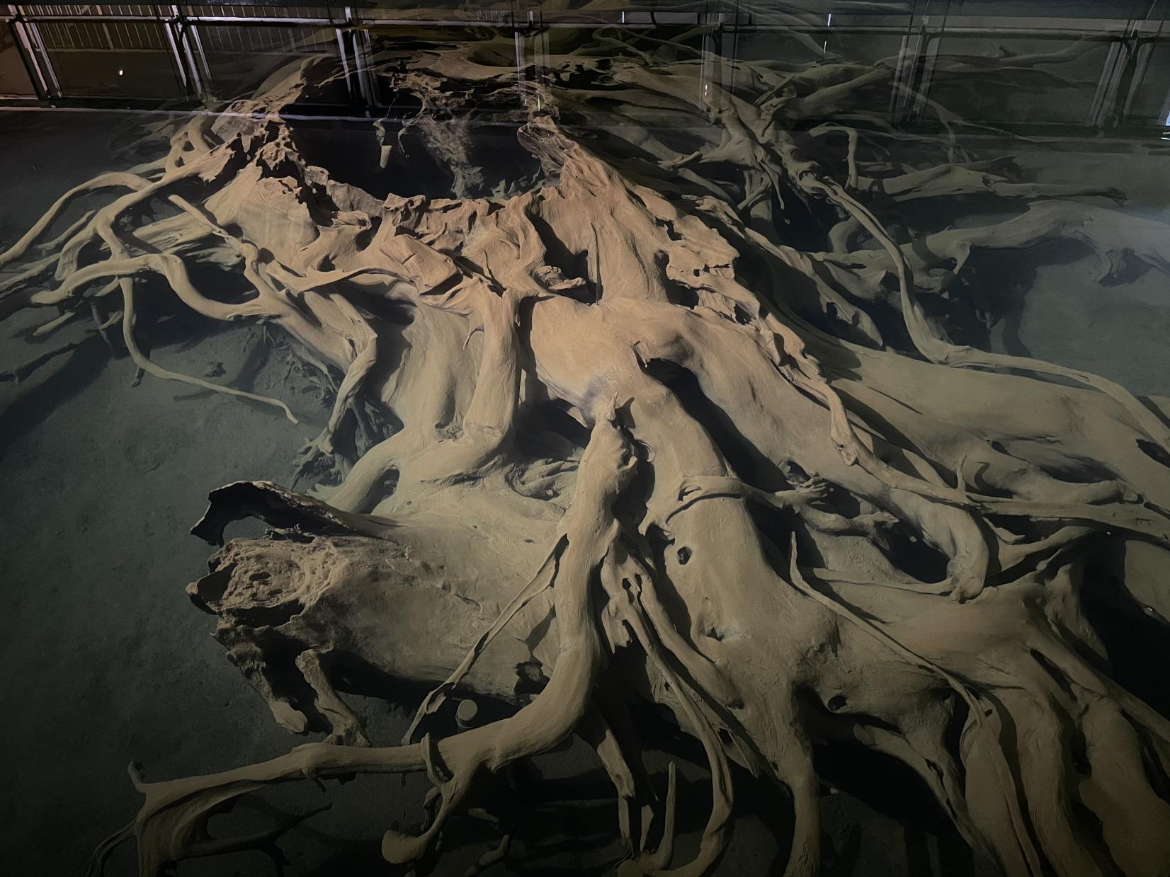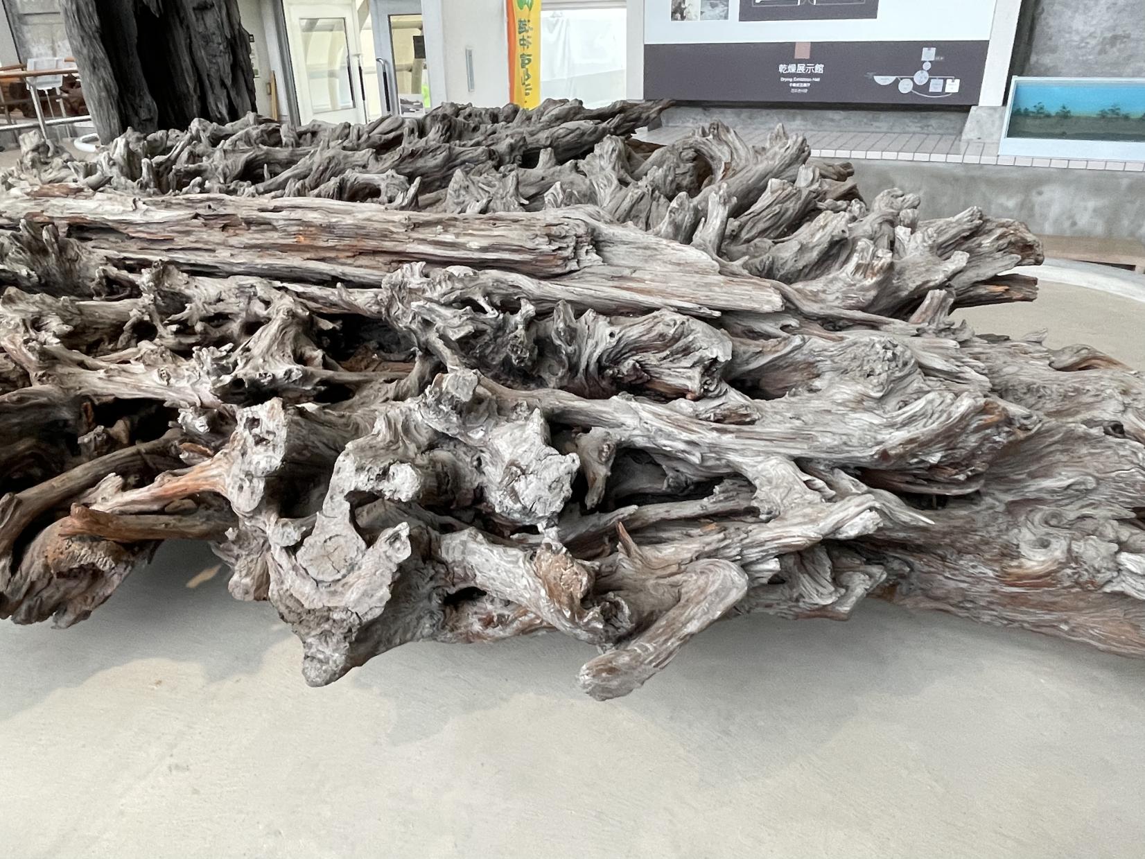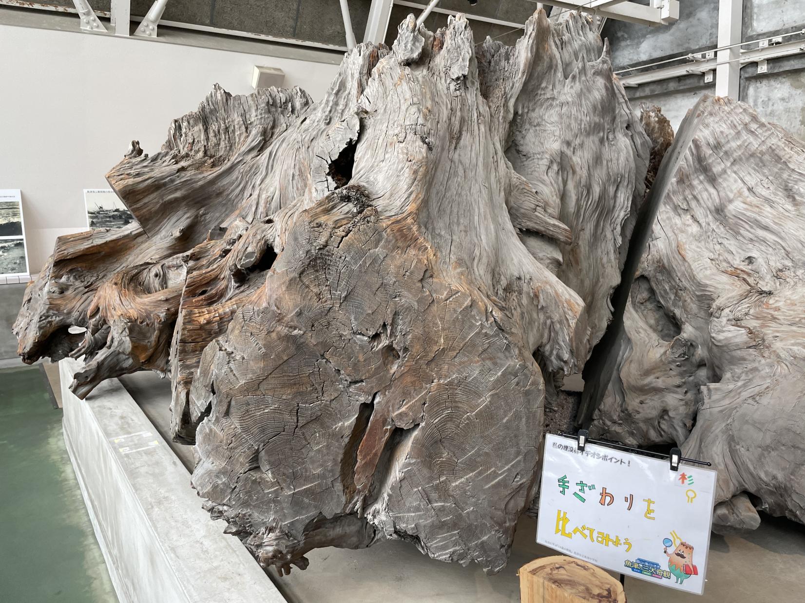 「水中展示館」のお隣「乾燥展示館」では埋没林に触ることができます。