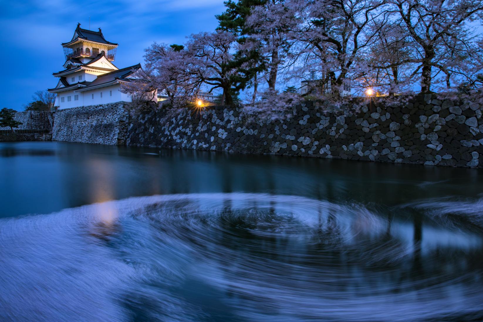また、近くの富山城では、桜のピークが過ぎた頃にお堀に散った花びらが溜まります。朝夕の薄暗い時間帯やNDフィルターを使用して長時間露光で撮影すると花筏の写真が撮影できます。ぜひチャレンジしてみてください。