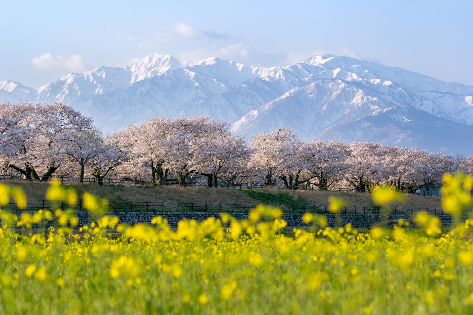 四重奏が見られなくても、桜とチューリップそれに北アルプスが織りなす景色は十分見応えがあります。川沿いから桜を撮っても絵になるので、撮影位置を変えながら写真を撮ってみてください。