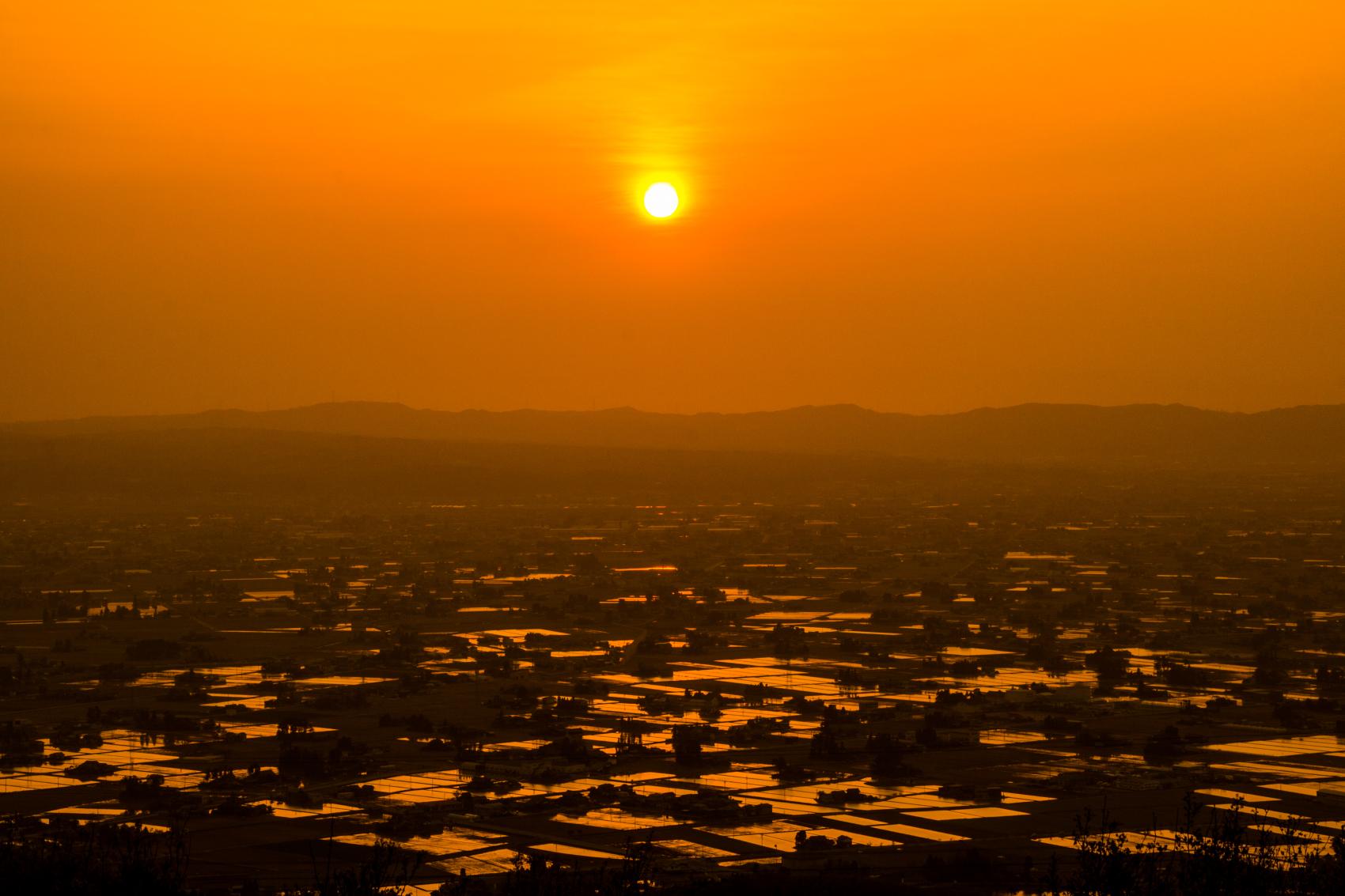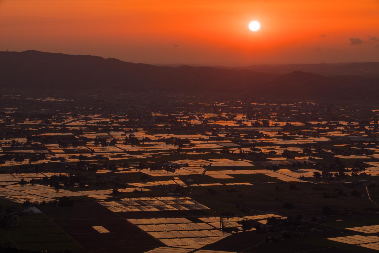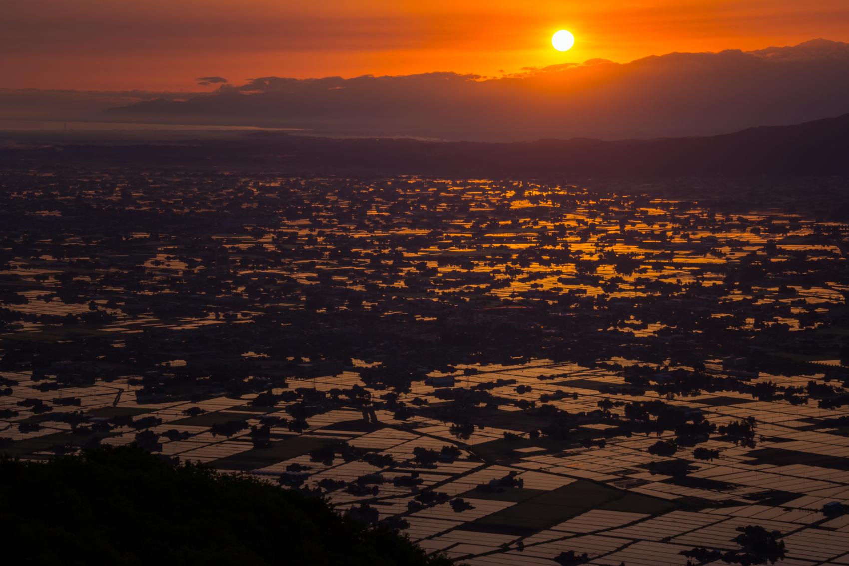 田植えの時期に水が張られ、水鏡となった水田が夕焼け色に染まる様子は得も言われぬ美しさがあります。