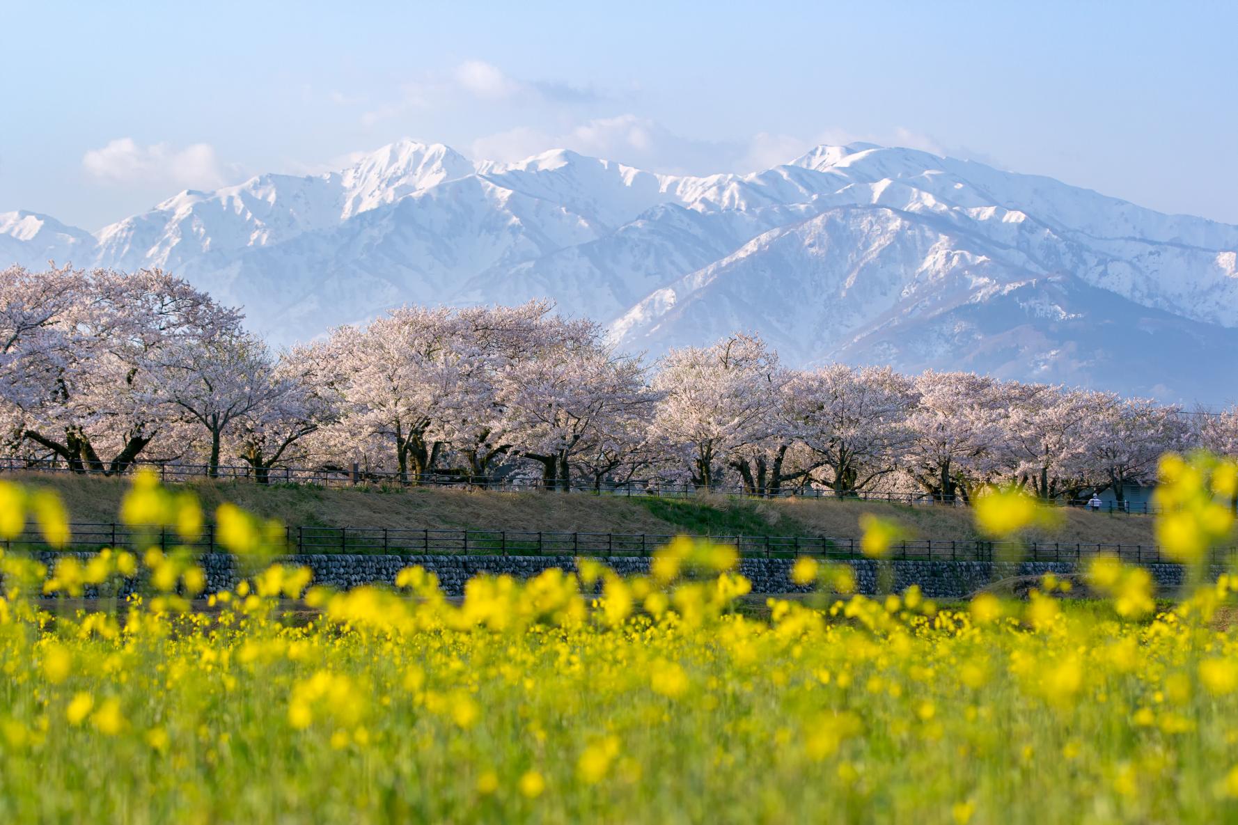 「春の四重奏」とは、桜、チューリップ、菜の花、北アルプスの山々が一望して眺めらる景色で、SNS映え間違いなしの絶景です。