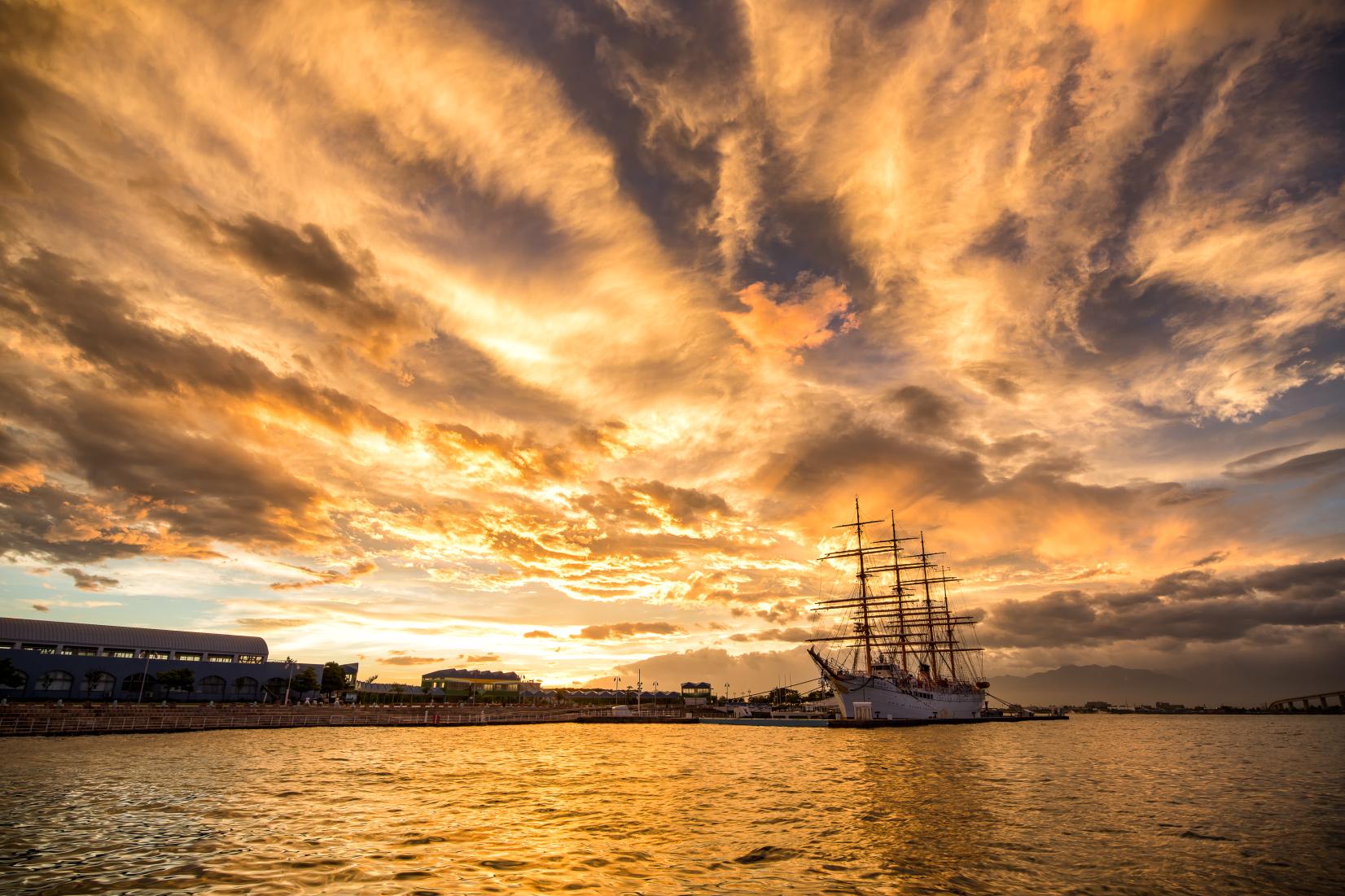 海王丸パークでは朝焼けと絡めて撮影するとエモい写真が撮れます。台風通過後、もしくは日の出後から天気が崩れそうな日の朝を狙うとエモい朝焼けが撮れる可能性が高くなります。