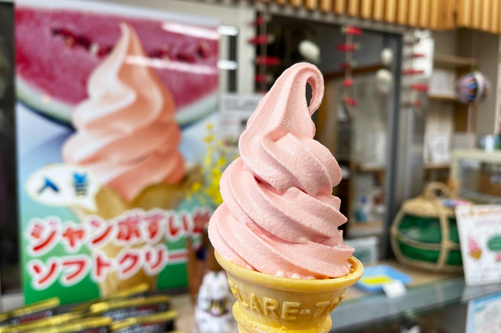 【おみやげ・お食事処 柏や】ジャンボスイカソフトクリーム