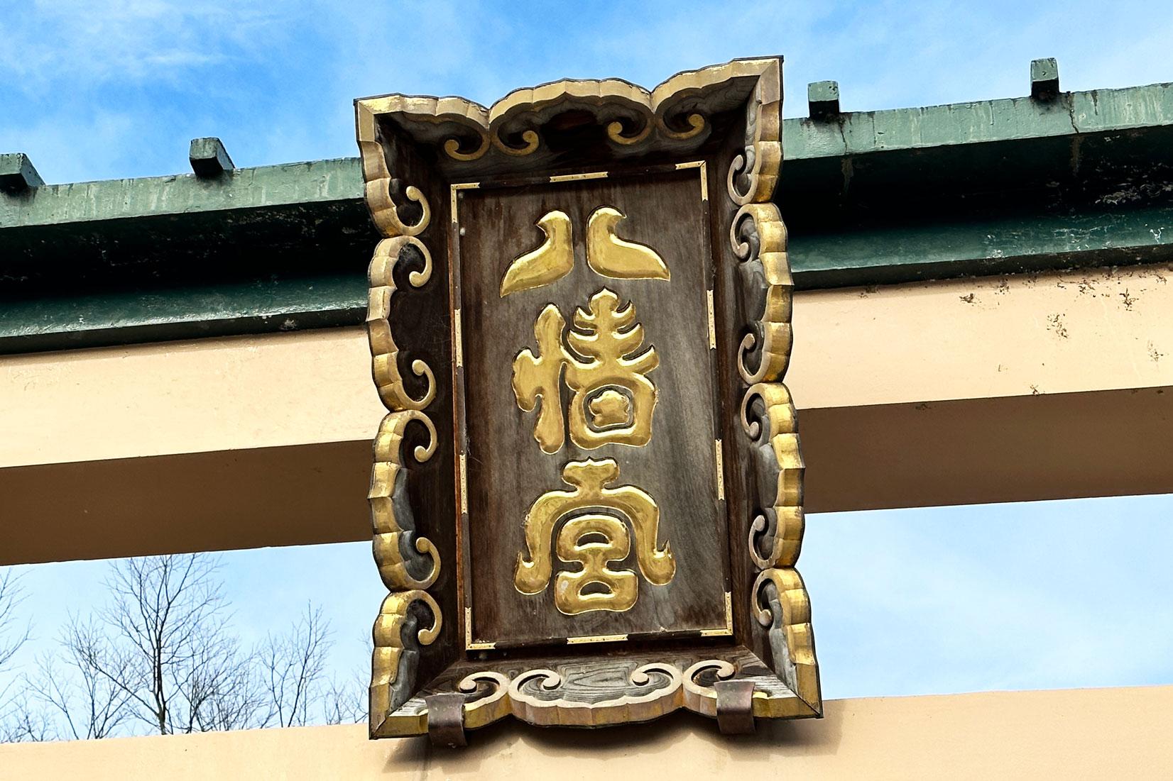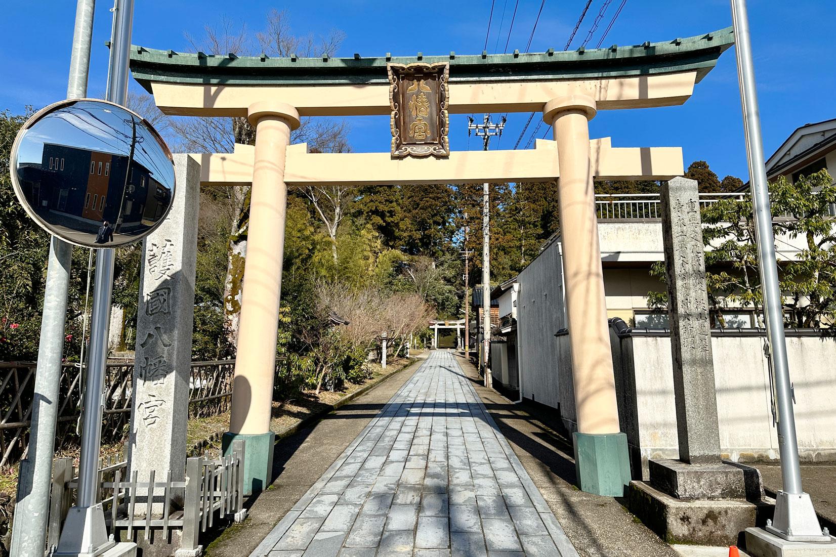 鳥居の扁額(へんがく)の「八幡宮」の文字の中に、神の使いとされる動物が隠れています。