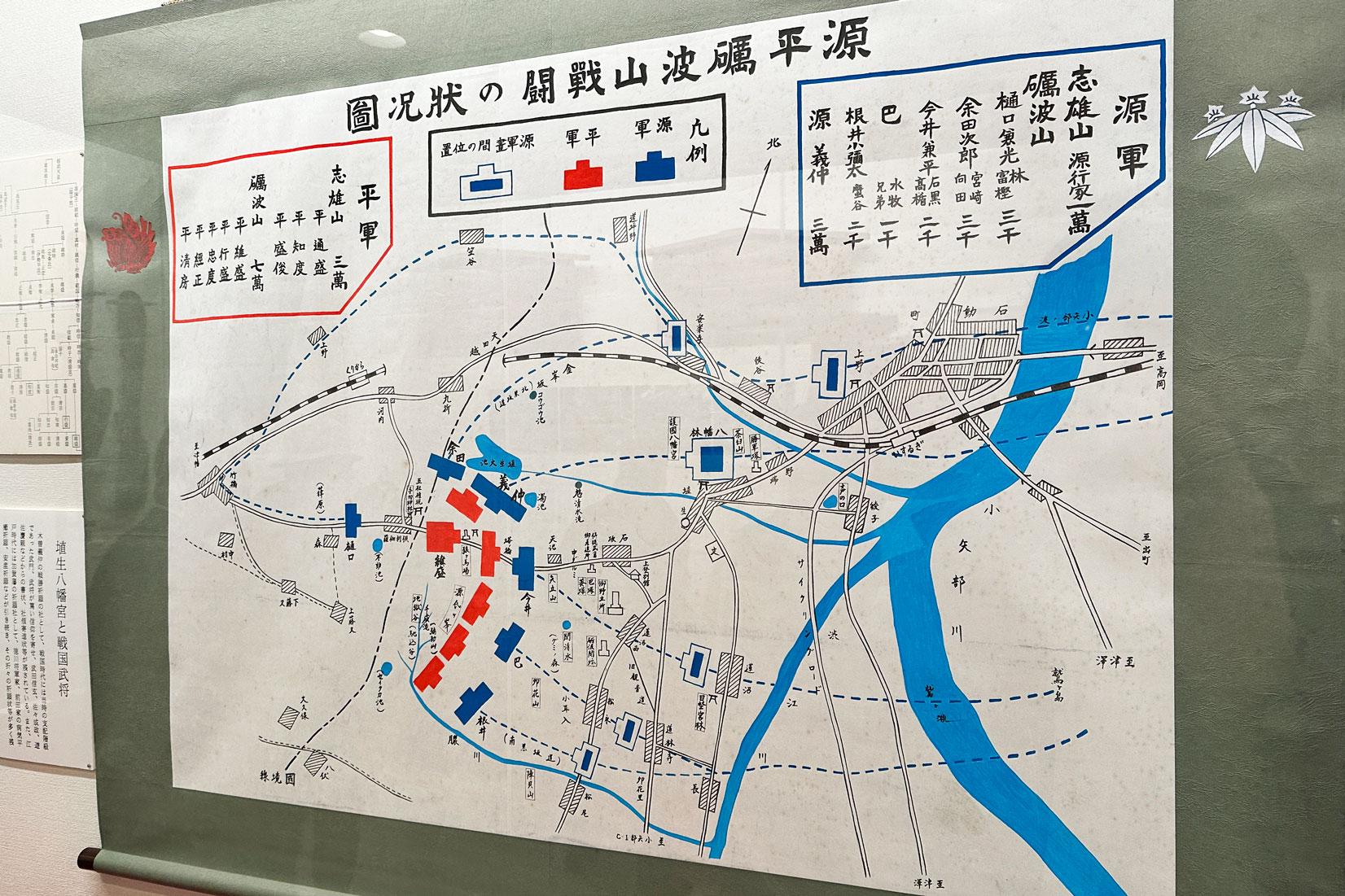 倶利伽羅峠 (砺波山) の戦いのときの源氏と平家のそれぞれの軍勢の数、配備などがマップで分かるのでかなり興味深い絵図です。