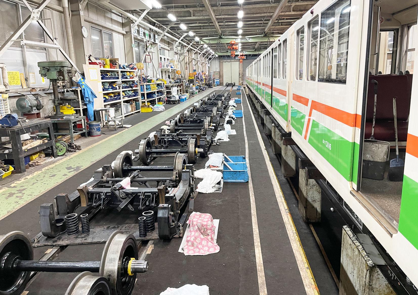 車庫で行われているのは、トロッコ電車の整備と点検。