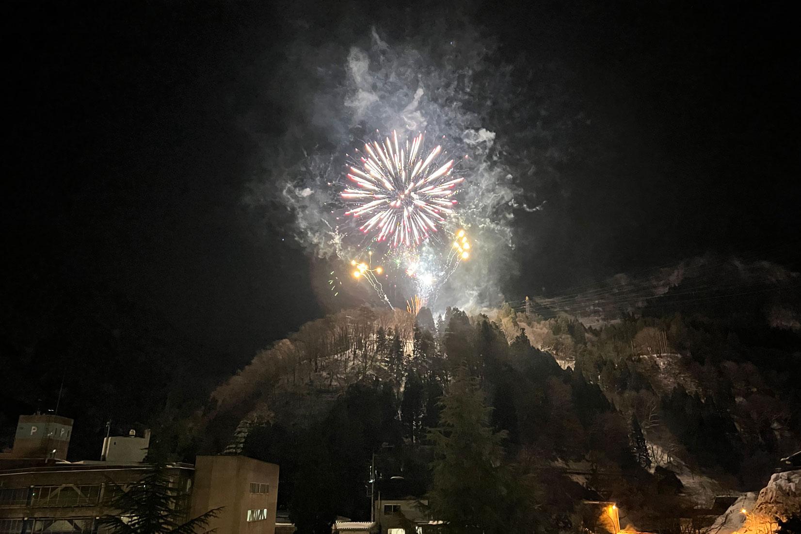 宇奈月温泉街では、冬の期間、毎週土曜日20:30から約10分ほどの花火が上がります。雪景色に上がる冬の花火は、夏花火とは違った魅力があるのでぜひ見てみてください。