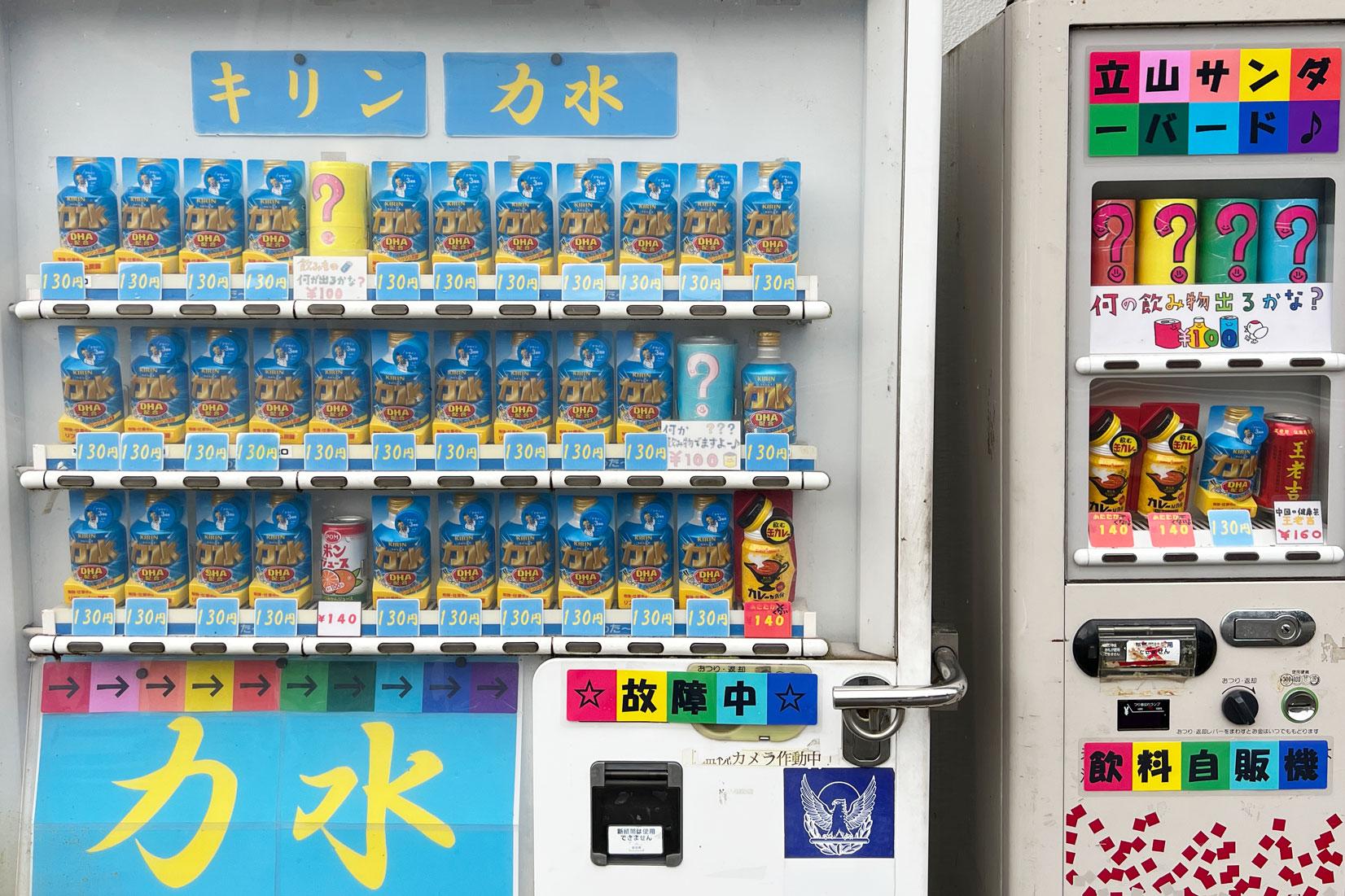 ほぼ「力水」しかない自販機と、「何の飲み物が出るかな?」と書かれた自販機。