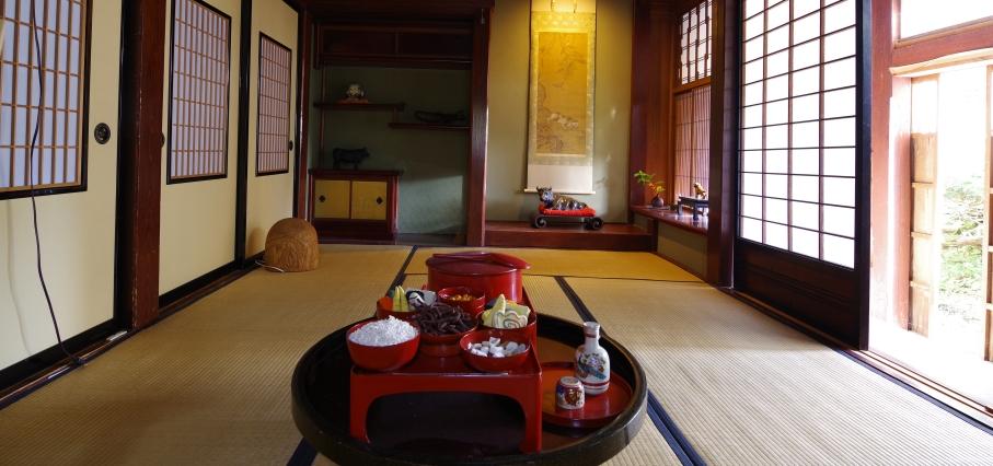 すすに燻された梁、わら縄など、歴史的民家である合掌造りの内部構造がよくわかります。