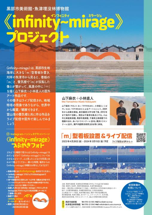 《infinity~mirage》は、アーティストの山下麻衣+小林直人さんの作品、富山県黒部市の海辺の堤防に設置した、大きな「m」型の看板を、対岸の魚津市内の海辺から観察すると、蜃気楼によりmが反転し「∞」となって見えるものです。