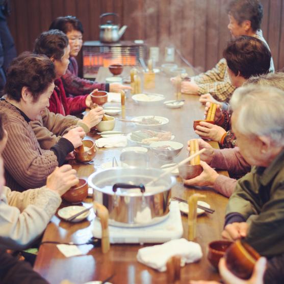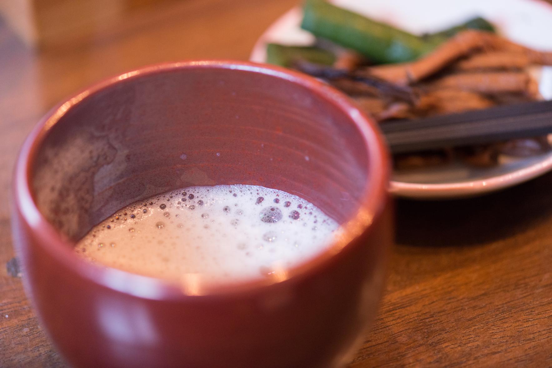 バタバタ茶は、中国伝来の後発酵茶「黒茶」でプーアール茶の仲間。地域のつながりを深めるお茶会は、山村で続く大切な生活文化です。蛭谷地区にある「バタバタ茶伝承館」では、いつも地域のおじいちゃんおばあちゃんが集い、バタバタ茶会の雰囲気を体験できます。五郎八茶碗にお茶を注ぎ、茶筅でカタカタといい音を響かせ泡立てていただきながら、みなさんとの会話も弾みます。当番の蛭谷のお母さん手づくり、地元で採れた山菜やお野菜を使ったお煮しめや漬物のお茶請けが絶品で、作り方を教わることも楽しみのひとつです。