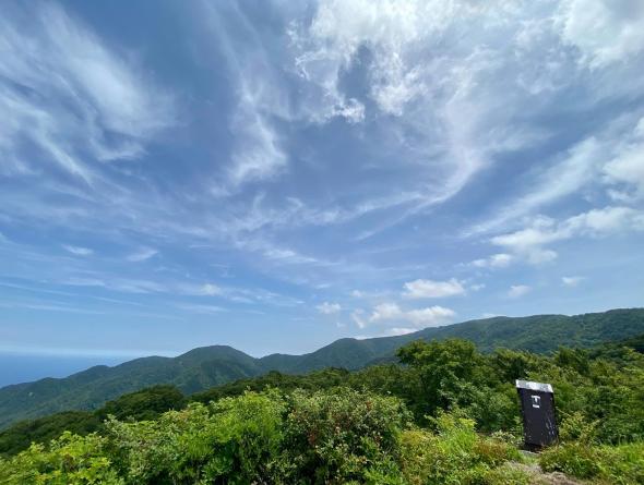 登山道の標識が立つ登山口から、カラマツの植林を過ぎると尾根に取り付き、海岸線と平行に伸びる稜線を小鳥のさえずりを聴きながら登ると山頂に着きます。