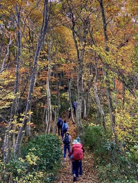 林道を横切り、ブナやナラの樹林を進むと、次第に背の低い灌木の細尾根となり、風雪に耐えた五葉松が現れます。