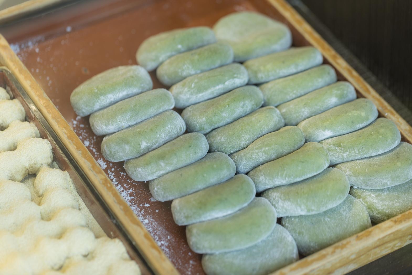 新湊の地で100余年続く餅専門店。毎朝作るつきたて餅を使った商品は、人気ゆえに午前中で売り切れてしまうものも。おすすめは、きな粉たっぷり素朴な味の串だんご。添加物を使用しない、つきたての本当お餅をご堪能ください。